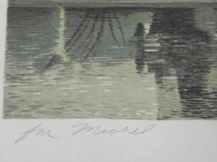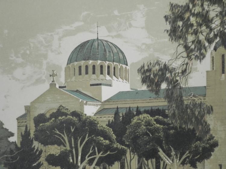 A green domed white church rests in a peaceful setting near a pond. Artist: Merv Corning Signature: In pencil, lower right Medium: Lithograph on paper Edition: Unnumbered, dedicated artist's proof, marked "For Michel" in pencil, lower left Publisher: Circle Gallery- blind stamp, lower left Sheet size: 21 1/2 x 24 inches Condition: Excellent Biography:Corning is known primarily as a sports artist, and the NFL has commissioned him to paint more than 300 subjects. He did a series of WW I planes commemorating some of the world's greatest pilots. Corning's work has been exhibited by the Smithsonian Institution, the Pentagon, the Pro Football Hall of Fame, the California Museum of Science and Industry, the Chicago Historical Society and the United States Air Force Museum. His work is held in the permanent collections of the Smithsonian Institution, the U.S. Air Force and other major museums, as well as in prestigious public and private collections.