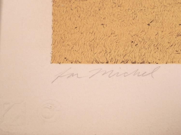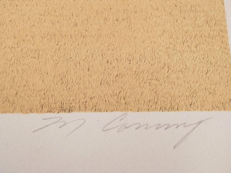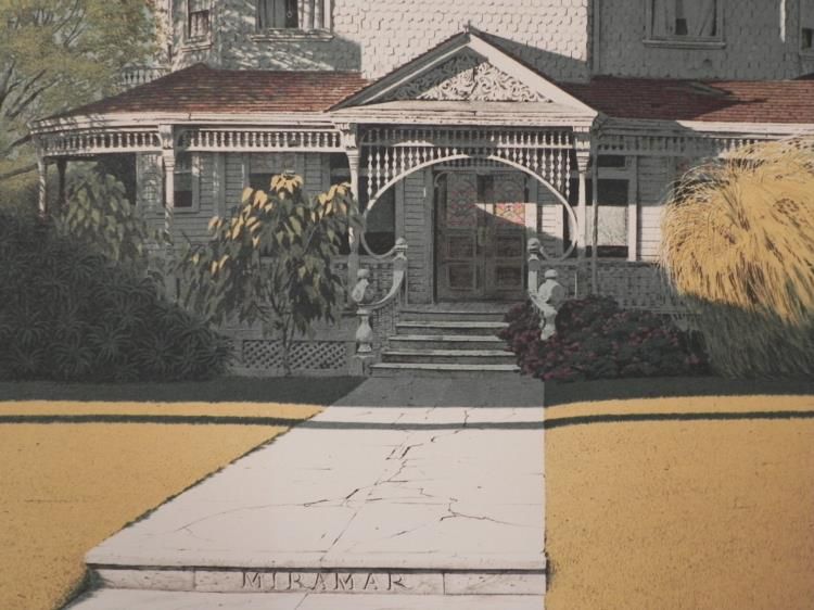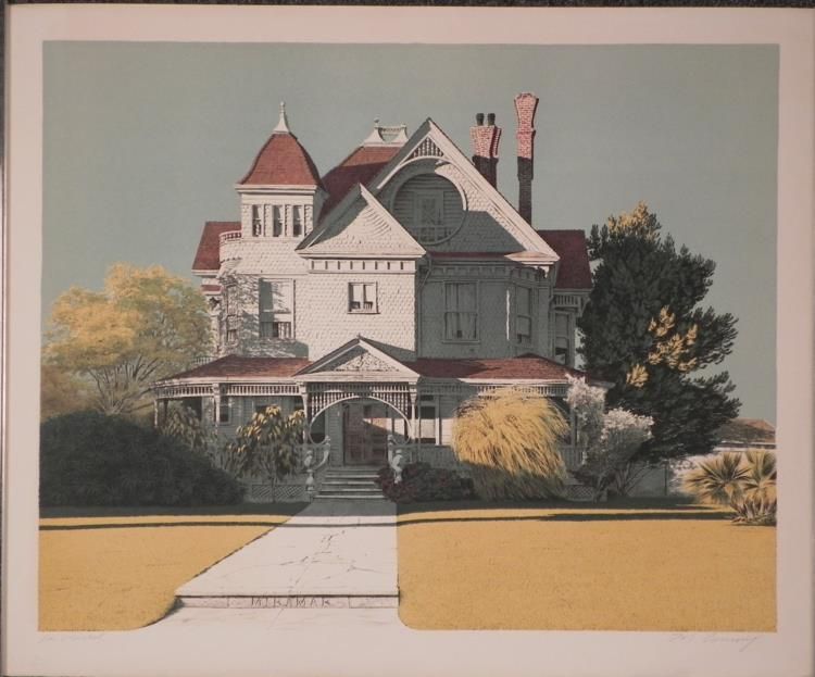 A grand old Victorian home sits on a stately yellowed lawn by the coast. * * * Artist: Merv Corning * Signature: In pencil, lower right * Title: Miramar House * Year: 1979 * Medium: Lithograph on rag paper * Edition: Unnumbered, dedicated artist's proof, marked "For Michel" in pencil, lower left * Publisher: Circle Gallery- blind stamp, lower left * Sheet size: 29 x 24 inches * Condition: Excellent * * * Biography: * Corning is known primarily as a sports artist, and the NFL has commissioned him to paint more than 300 subjects. He did a series of WW I planes commemorating some of the world's greatest pilots. Corning's work has been exhibited by the Smithsonian Institution, the Pentagon, the Pro Football Hall of Fame, the California Museum of Science and Industry, the Chicago Historical Society and the United States Air Force Museum. His work is held in the permanent collections of the Smithsonian Institution, the U.S. Air Force and other major museums, as well as in prestigious public and private collections. *