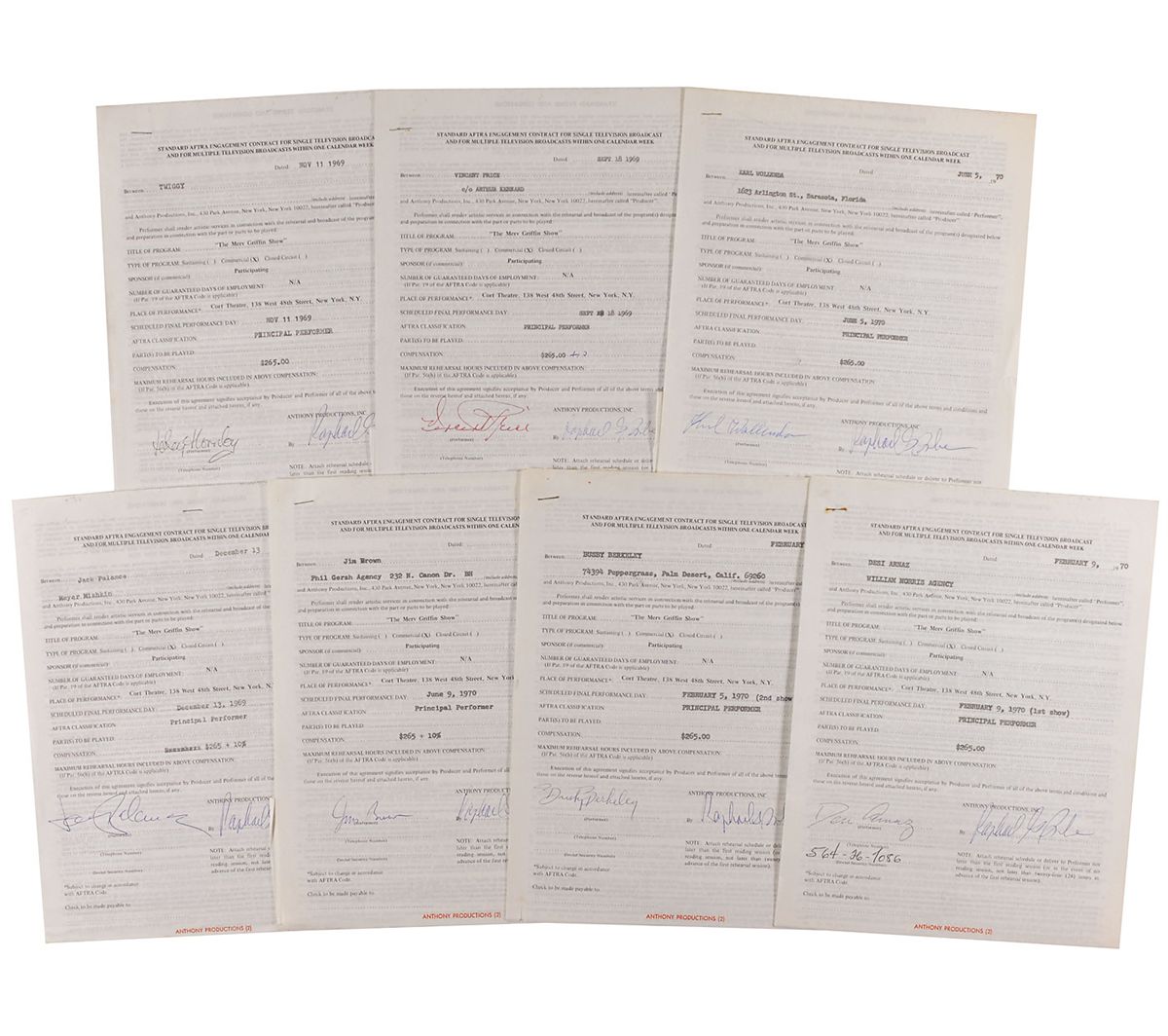 Seven DSs, each one page, 8.5 x 11, 1969–70. Standard AFTRA contracts in which various figures agree to appear on The Merv Griffin Show in exchange for $265. Signers are: Twiggy, Vincent Price, Karl Wallenda, Jack Palance, Jim Brown, Busby Berkeley, and Desi Arnaz. Standard AFTRA riders are stapled to the main documents in the upper left. In overall fine condition, with expected document wear.