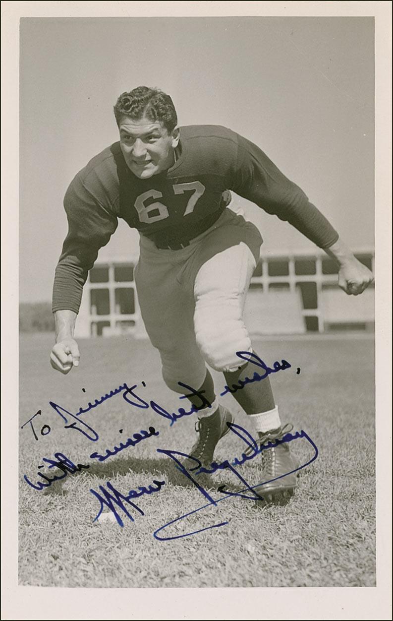 College Football Hall of Famer. Vintage glossy 2.75 x 4.25 photo, signed and inscribed in fountain pen “To Jimmy, With sincere best wishes, Merv Pregulman.” In very good condition, with scattered noticeable creases to image and background.