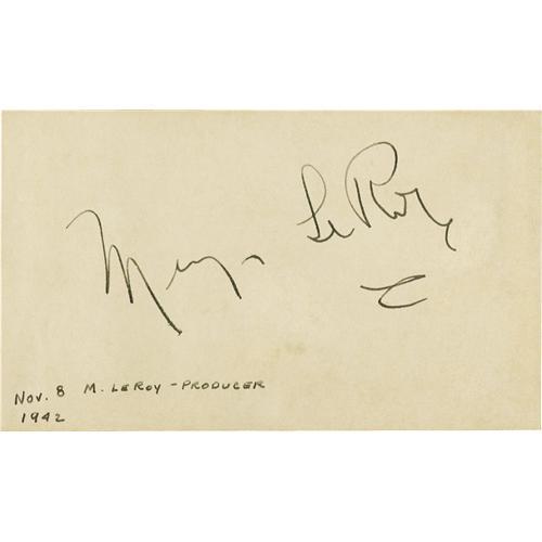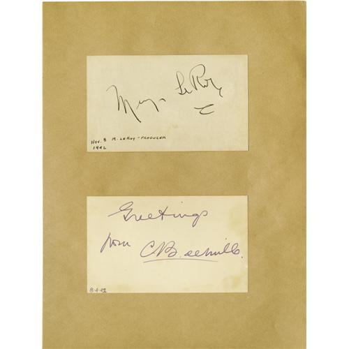 <B>Mervin LeRoy and Cecil B. DeMille Signed Notecards.</B></I> Includes a 3" x 5" notecard signed by LeRoy in black ink and a notecard signed by DeMille in purple ink, both mounted to a photo album page and in Excellent condition with moderate overall tanning. <I>With COA from PSA/DNA.</B></I>