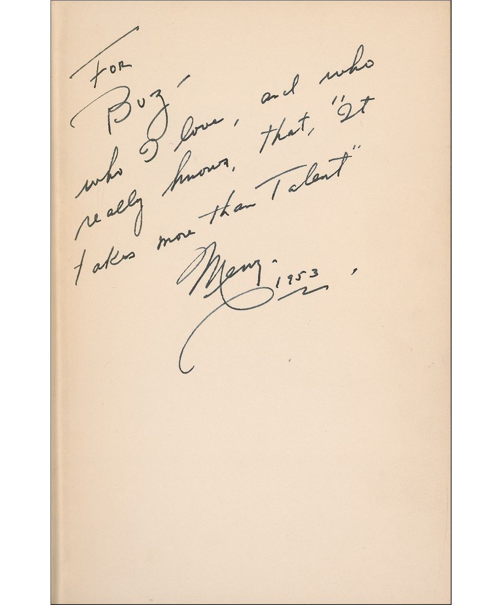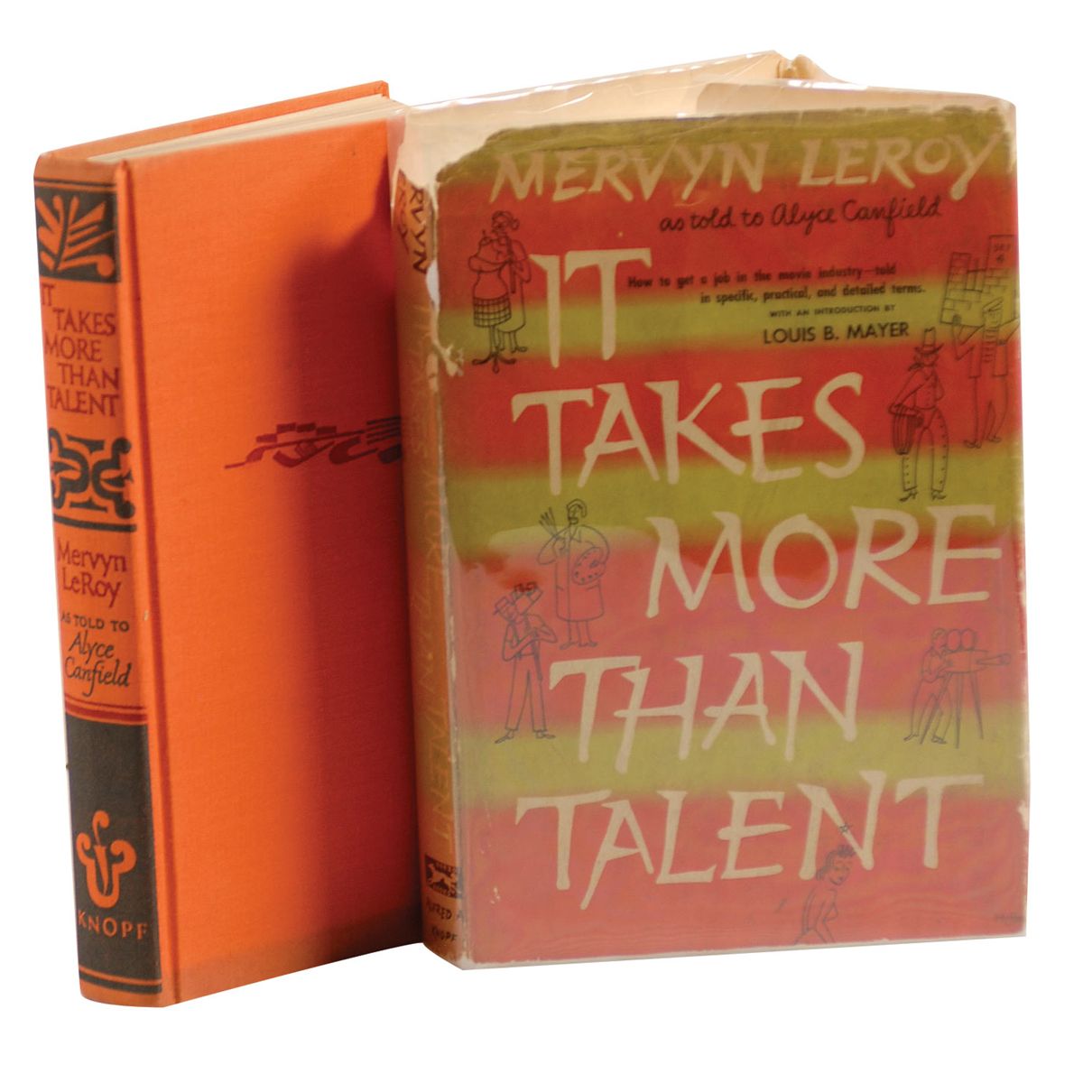 Signed book: It Takes More Than Talent. First edition. NY: Alfred A. Knopf, 1953. Hardcover with dustjacket, 6 x 8.5, 300 pages. Signed and inscribed on the first free-end page in black ink to Busby Berkeley, “For Buzz—who I love, and who really knows, that, ‘It takes more than Talent,’ Mervyn, 1953.” In fine condition, with uniform toning to the pages, loose hinges, the back hinge separated and the front intact, and some moderate paper loss to the top of the spine on the dustjacket.