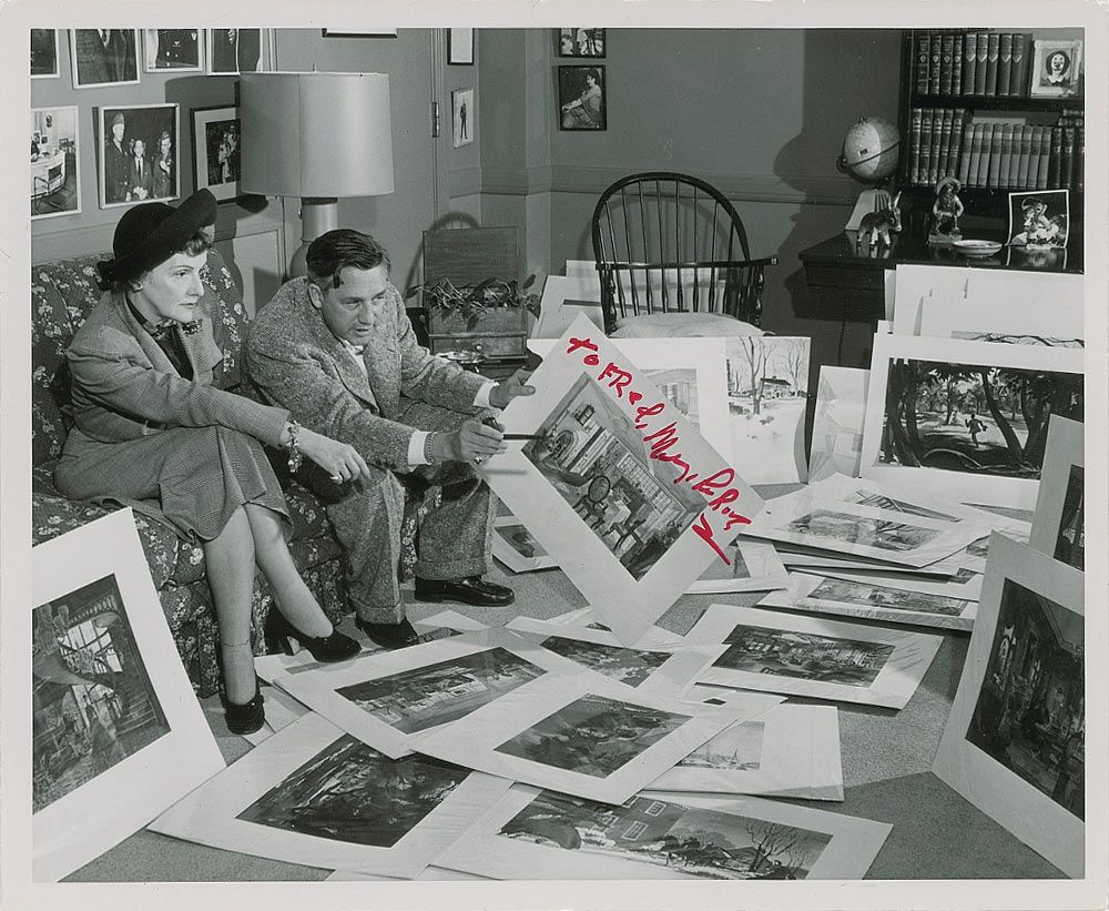 Vintage glossy 10 x 8 double-weight MGM publicity photo for Little Women featuring LeRoy going over some production set sketches, boldly signed and inscribed later, on a strategically placed area of the photo, optimizing the signature contrast, in red felt tip “To Fred, Mervyn LeRoy.” Reverse of the photo bears printed promotional information. In fine condition, scattered spotting and rippling to emulsion, only visible at an angle.