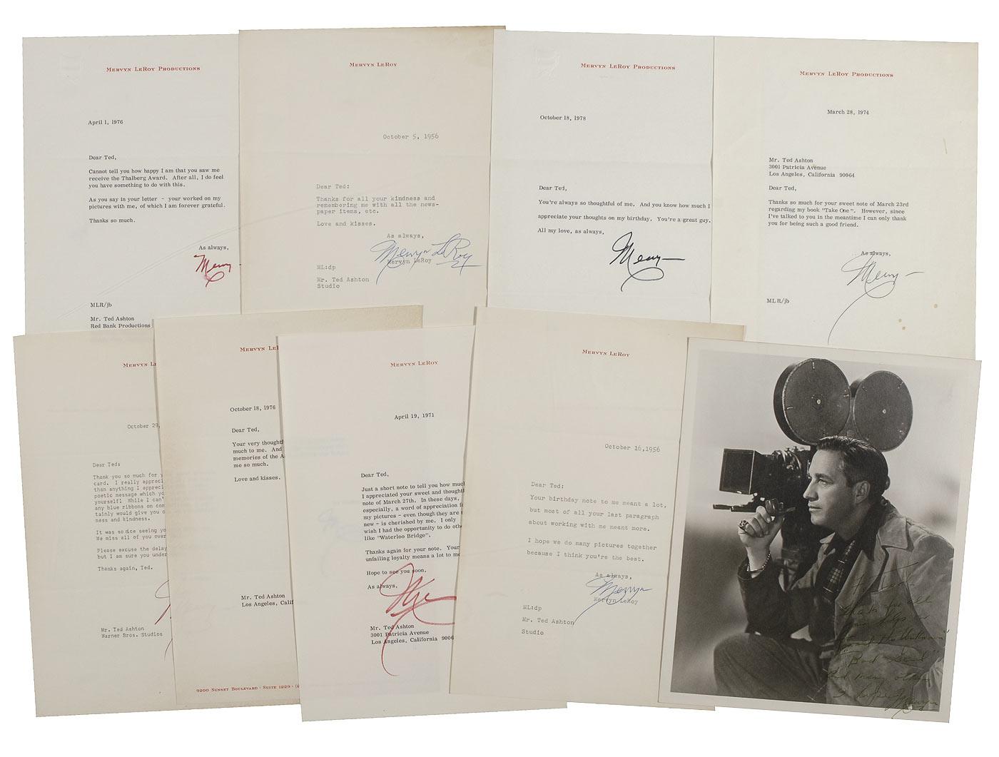 Nine items: Impressive vintage matte-finish 8 x 10 photo of LeRoy sitting pensively with his camera. Signed and inscribed in green ink, “For Ted, Thanks for all your help on ‘Toward The Unknown’ ‘Bad Seed’ and many others I hope, Mervyn”; and eight TLSs to Ted Ashton, dating from 1956 up to 1976, seven signed “Mervyn,” and one signed in full, on both his personal and business letterhead, sending thanks for well wishes. Some light contrast to signature and inscription on photo, and some light toning to letters, otherwise fine condition. Also included is a sympathy card sent to Ted and signed by LeRoy’s wife.