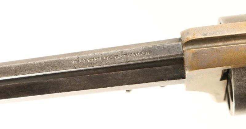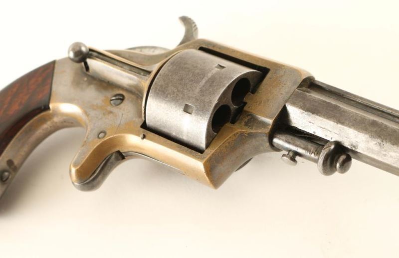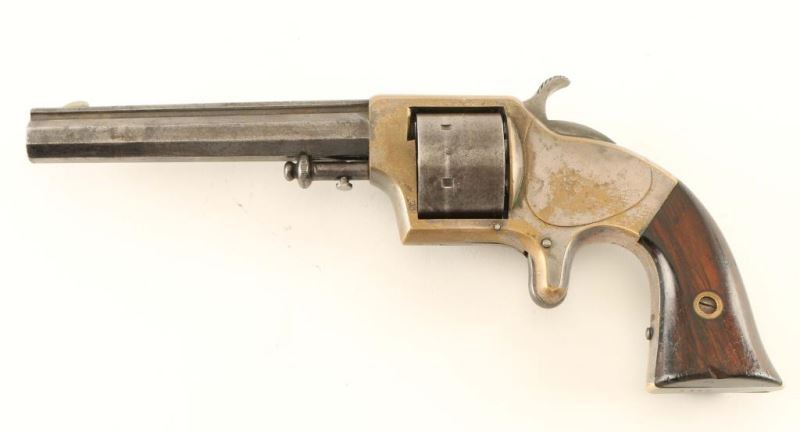 Interesting cupfire revolver developed to circumvent the Rollin White patent, circa1860's. Blued 5 1/4" octagon bbl with top rib, blade front sight, 'v' notched rear sight, six-shot cylinder, spur trigger, silver plated brass frame, & two-piece smooth walnut grips. Has been converted to fire centerfire rounds. Bbl exhibits approximately 25% bluing and the the frame retain approximately 40% of it's silver plate. The action appears mechanically sound but the hammer spring is broken. Bore is fair to good and the matching wood grips are near fine with a small chip to the left panel. Condition is fine. ***Antique Firearm***