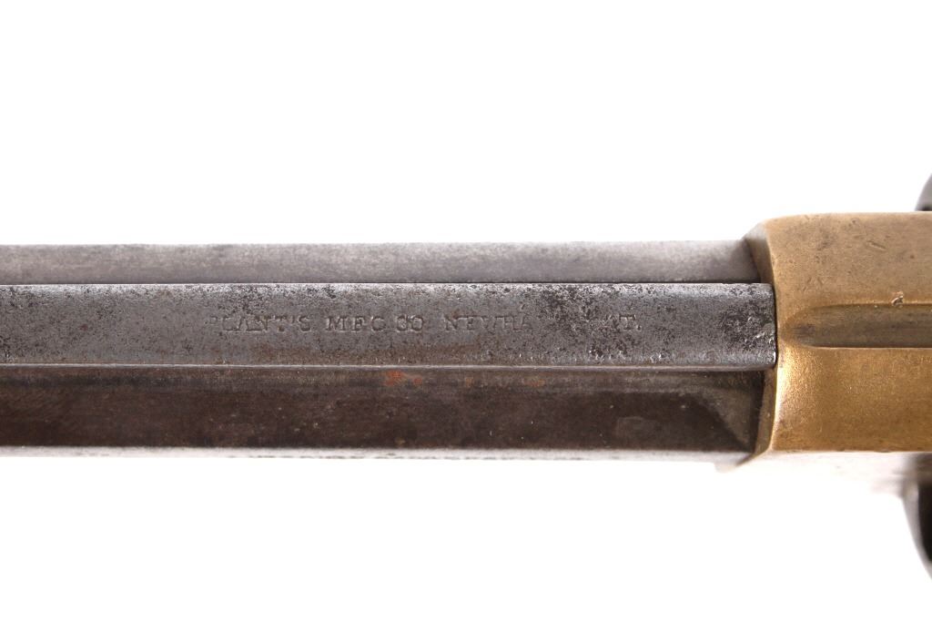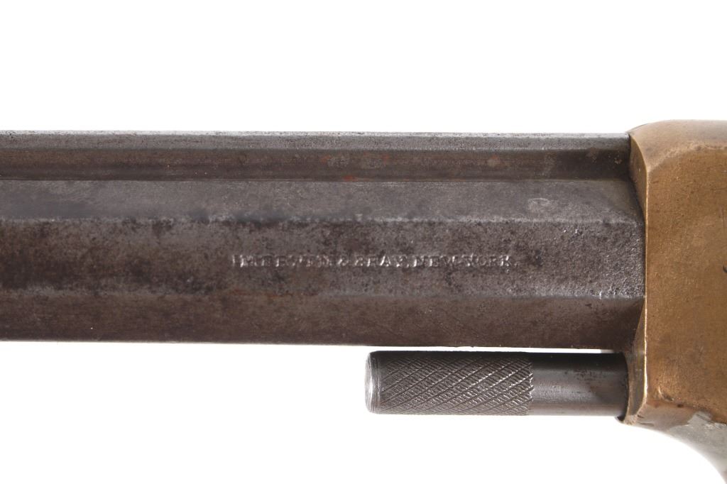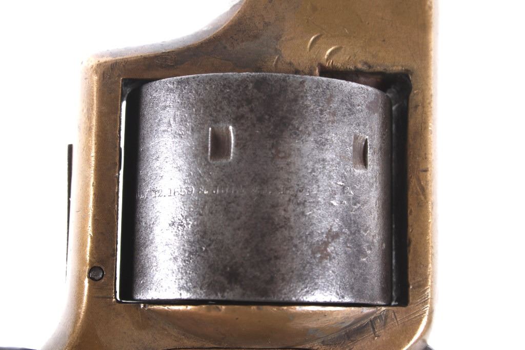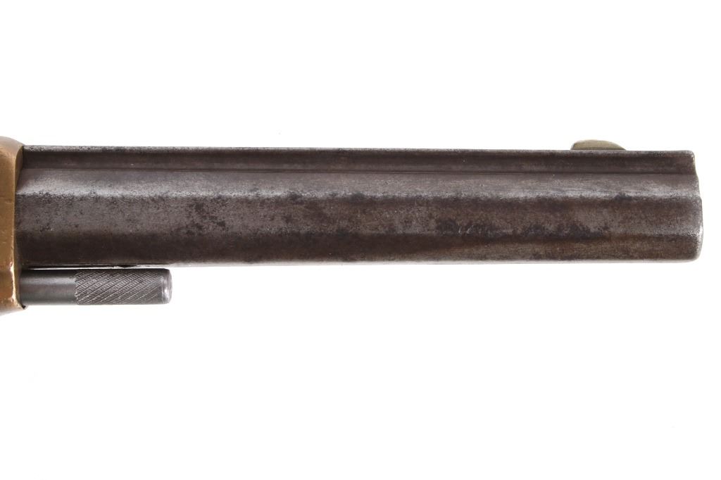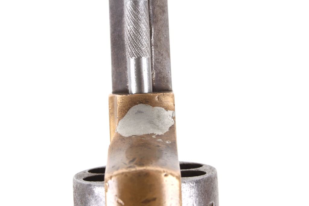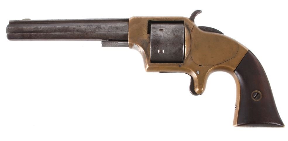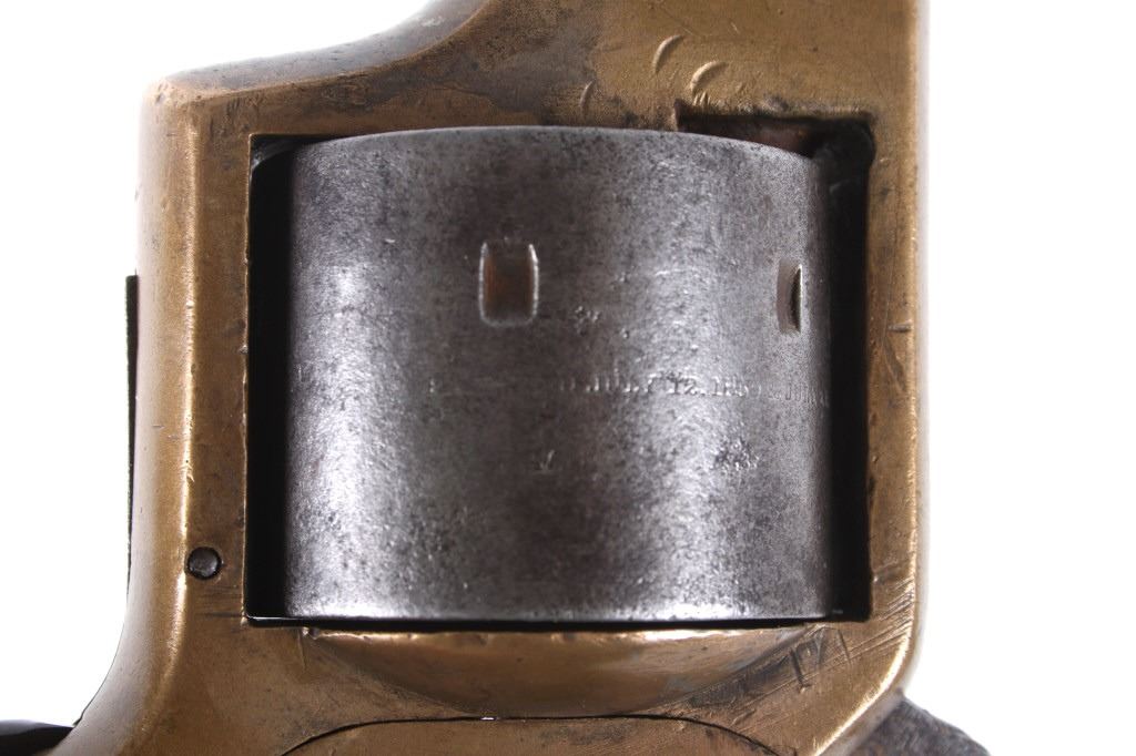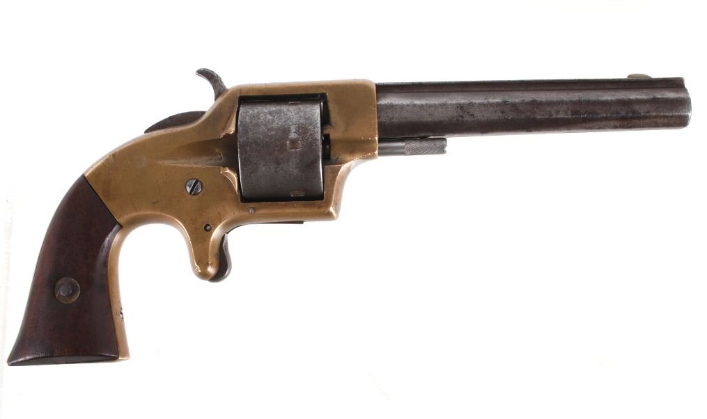 Featured in this lot we have a Merwin & Bray, Plants Patent, front loading single action Army revolver chambered in .42 caliber. The revolver displays a six shot cylinder, 5 1/2" long octagonal barrel, brass frame, and walnut grips. The top of the barrel is marked "Plants MFG Co New Haven CT" in faded lettering with the side of the barrel marked "Merwin & Bray New York" and "PATENTED JULY 12. 1859 & JULY 21. 1863" across the cylinder. The firearm is chambered in the .42 cupfire caliber, designed for front end loading. The revolver was manufactured in the 1860's, and was designed in such a way to not infringe on Smith & Wesson's "Rollin White" cylinder patent. Overall, the revolver shows very-good aesthetic condition, but will need some replacement parts for full mechanical condition. The hammer and trigger shows good condition with the cylinder rotation not working. Aesthetically, the revolver shows a mellow mustard yellow patina on the brass frame and a nice naturally aged blue on the barrel and cylinder. Serial Number: 6106. This firearm qualifies as an Antique, and does not require FFL Transfer or NICS Background Check.