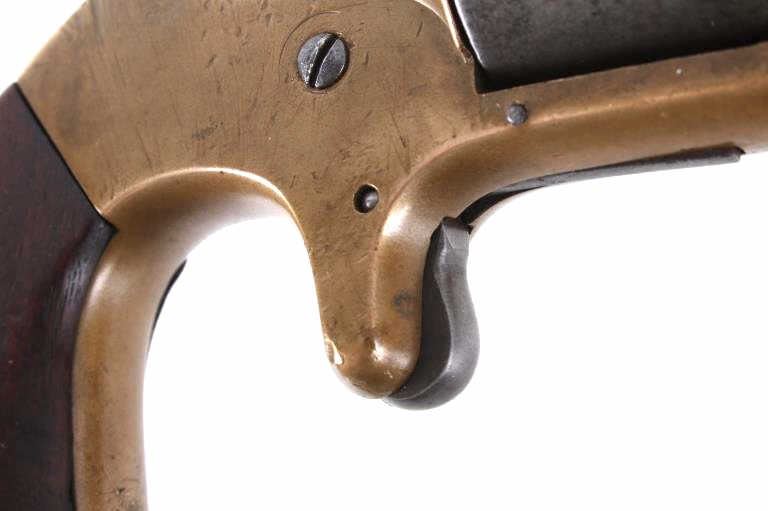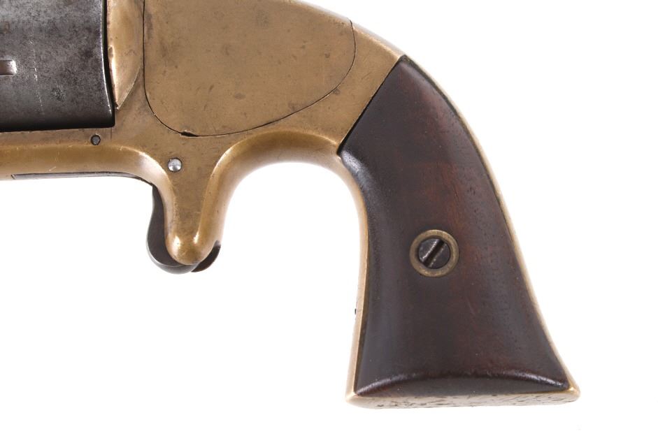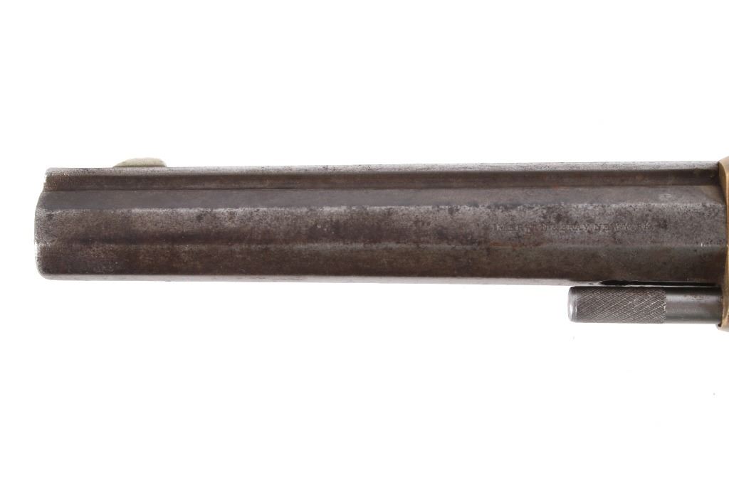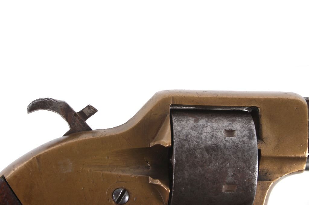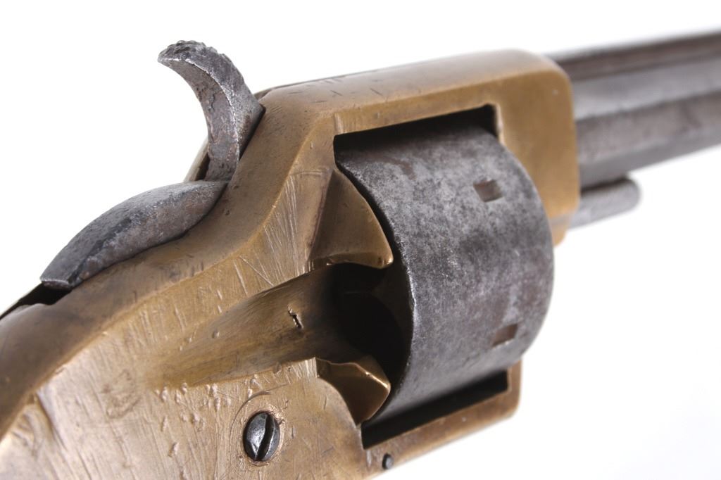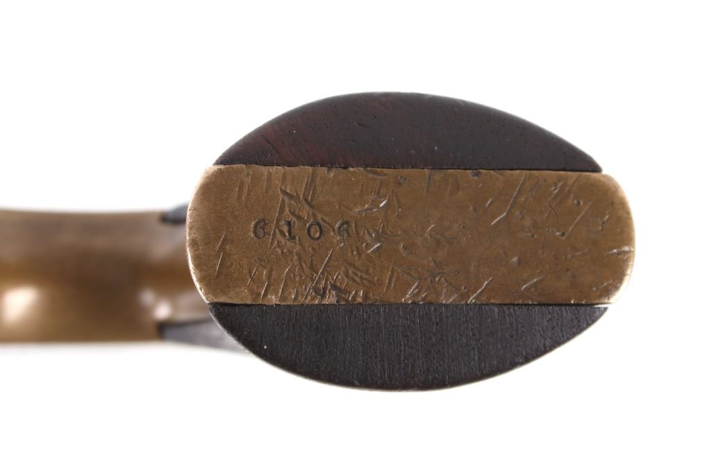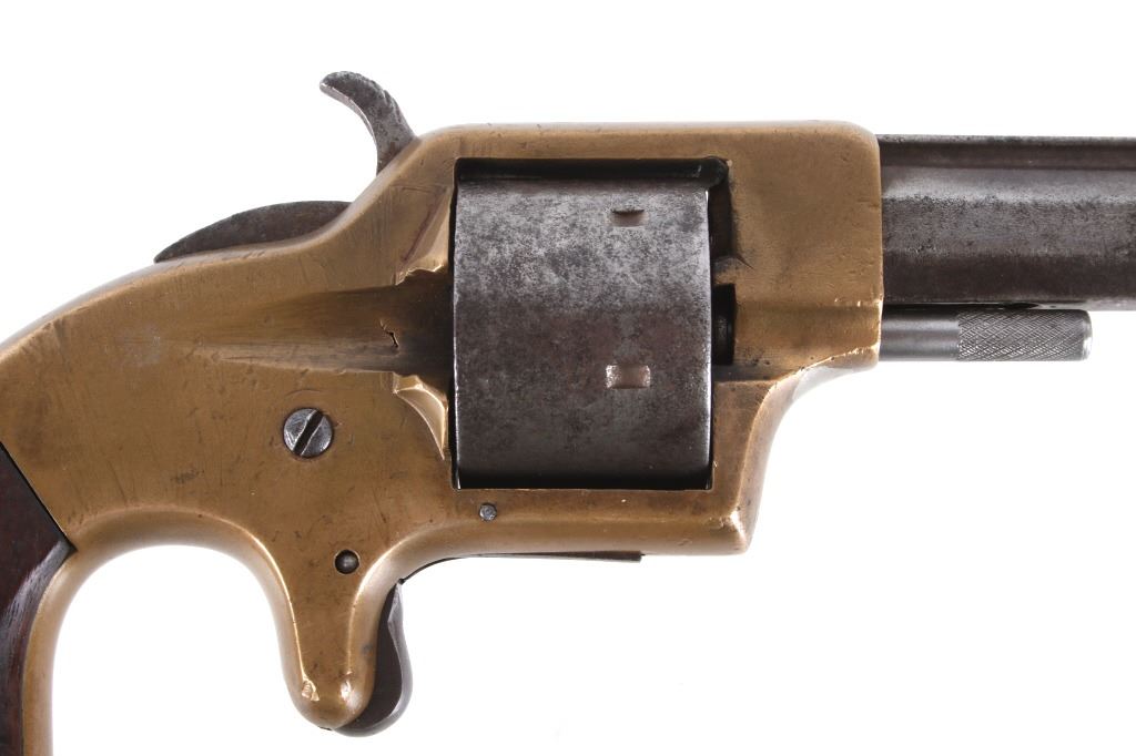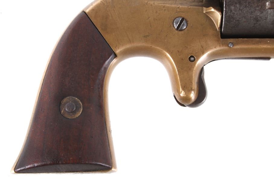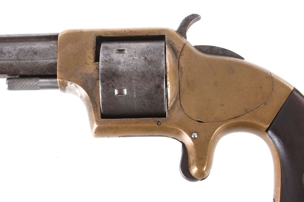 Featured in this lot we have a Merwin & Bray, Plants Patent, front loading single action Army revolver chambered in .42 caliber. The revolver displays a six shot cylinder, 5 1/2" long octagonal barrel, brass frame, and walnut grips. The top of the barrel is marked "Plants MFG Co New Haven CT" in faded lettering with the side of the barrel marked "Merwin & Bray New York" and "PATENTED JULY 12. 1859 & JULY 21. 1863" across the cylinder. The firearm is chambered in the .42 cupfire caliber, designed for front end loading. The revolver was manufactured in the 1860's, and was designed in such a way to not infringe on Smith & Wesson's "Rollin White" cylinder patent. Overall, the revolver shows very-good aesthetic condition, but will need some replacement parts for full mechanical condition. The hammer and trigger shows good condition with the cylinder rotation not working. Aesthetically, the revolver shows a mellow mustard yellow patina on the brass frame and a nice naturally aged blue on the barrel and cylinder. Serial Number: 6106. This firearm qualifies as an Antique, and does not require FFL Transfer or NICS Background Check.