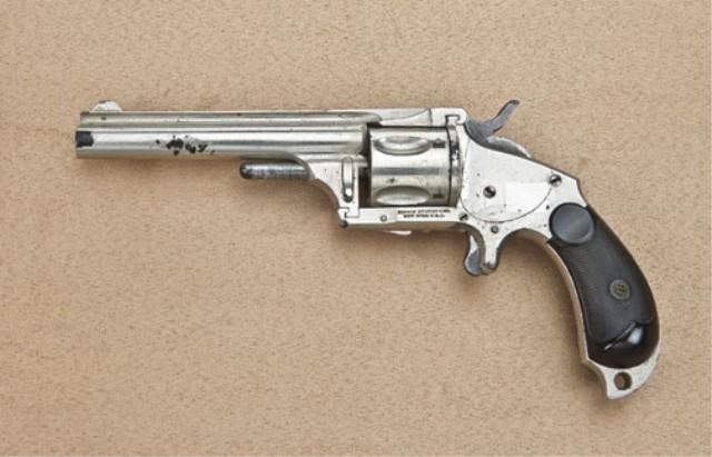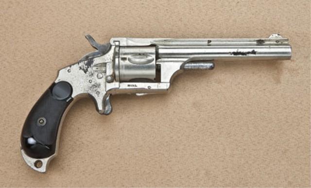 Merwin & Holbert, .38 caliber single-action revolver, with 4-1/2” barrel, nickel plated, hardrubber grips, serial #1396. The pistol remains in original good condition showing 70-80% original nickel, some peeling on the barrel and frame, areas where the nickel has lifted show a dark patina and some light to slightly heavy rust and erosion. The metal is completely uncleaned, the markings are sharp, the action is hesitating and almost working, not quite. The grips show some edge wear, the barrel address is good, interior good. Est: $250 - $500