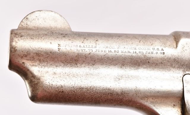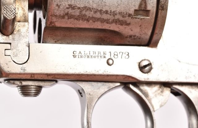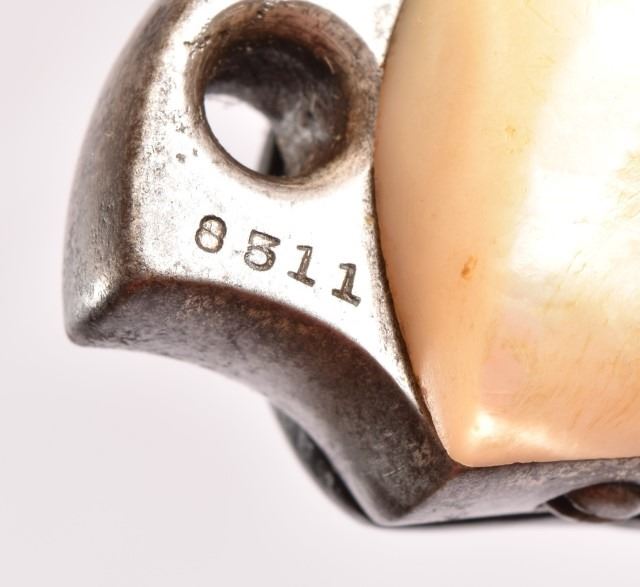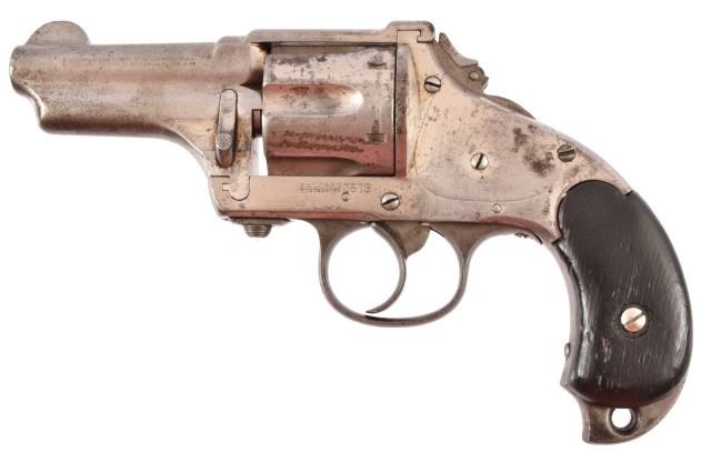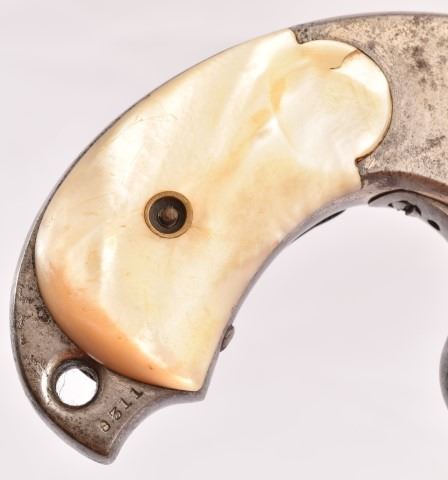 Double action, nickel plate, one pearl grip, flip up hammer, 44-40 cal. Serial no. 8311