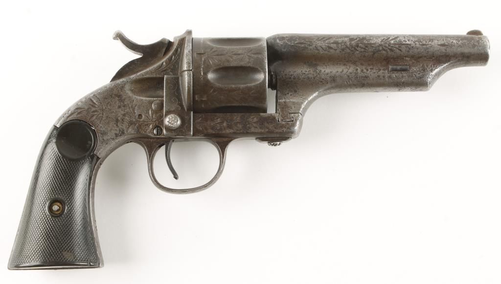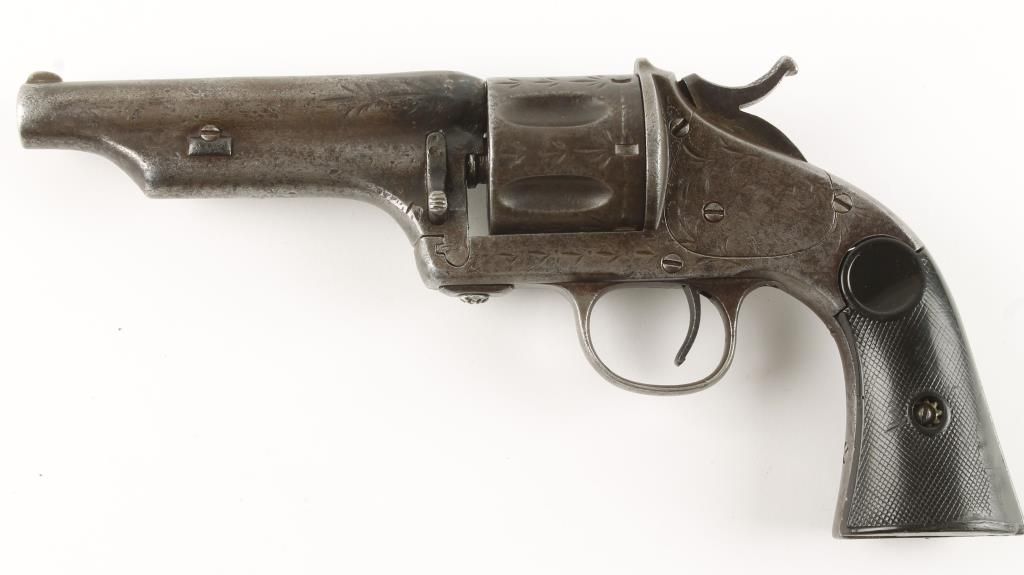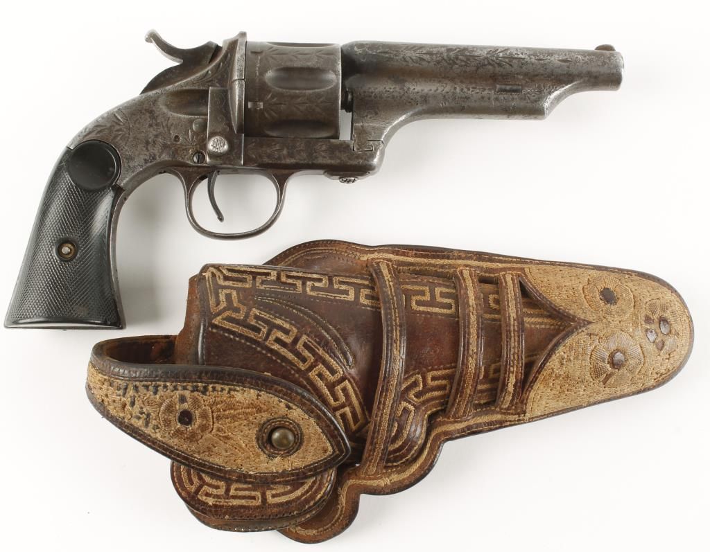 Early model single action open top 6 shot revolver circa 1880's with round barrel being cut down while in use to 4-3/4". Checkered square butt black hard rubber grips, scoop type cylinder flutes, wedge below barrel in front of cylinder pin housing, Period "leaf" engraving, drop down loading gate and fixed sights. Markings are faint and action in working order. Includes Fancy Mexican 3 loop Pitia do holster in aged condition circa 1880's-1890's. The intricate embroidery was skillfully done one stitch at a time with cactus threads. Traditional floral pattern. Small amount of stitching has come loose and a great patina is seen. Condition: Fair to good showing years of honest use with a gray patina and grips are good and show wear. *Antique Firearm*