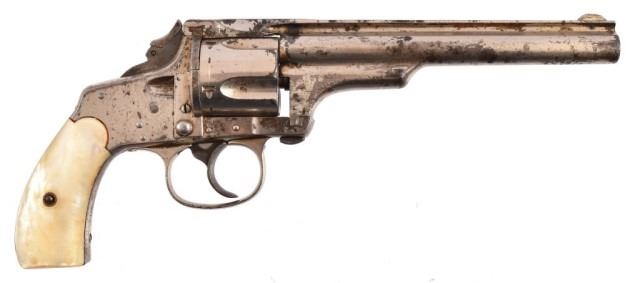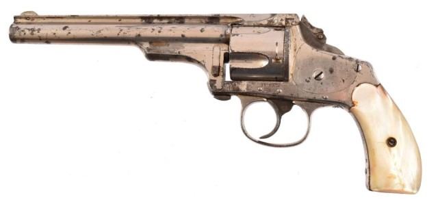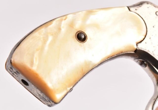 Double action small frame .38 cal, nickel with pearl grips, flip up hammer, 5.75" barrel. Serial no. 27368
