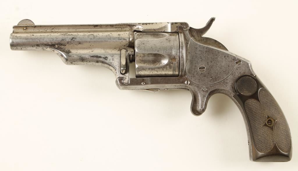 SN: 6681 Nickel plated spur-triggered single action centerfire 5-shot revolver with a 3-1/2" barrel and hard rubber grips made by Hopkins & Allen. The plating is worn to bare metal on much of the gun with much of the bare metal turned to brown patina. There is a drag line. The bore is dull with rifling and light pitting. The chambers are dirty with no damage. The checkered grips are lightly worn with a small chip out of the right grip corner. Action works well with slightly loose lock-up. Condition is good. *Antique Firearm*