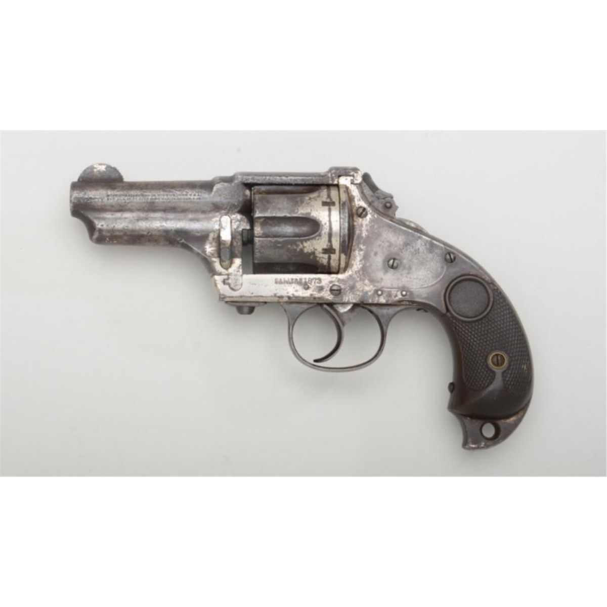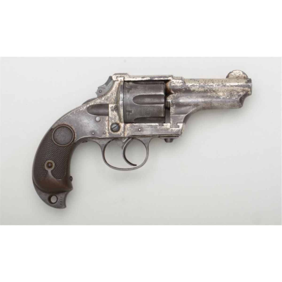 Merwin & Hulbert DA Pocket Army revolver, .44-40 cal., 3-1/4” barrel, nickel finish, checkered hard rubber grips, #6344. This gun is in uncleaned overall very good condition showing approx. 25% original nickel finishwith balance gone to a grey patina and scattered spots of erosion, dark bore, good action, folding hammer variation, good markings and overall good grips. Est.: $600-$1,200.