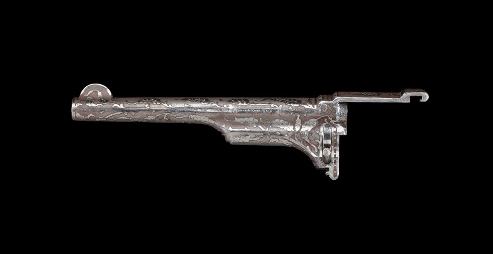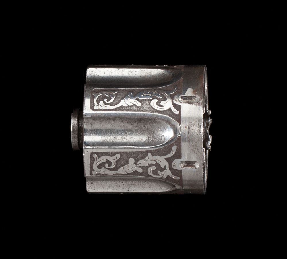 Second model single action in .44 Winchester. Serial #4201. Indian head motif, chiseled in high relief leaf and vine pattern. A matching fitted 7” barrel and cylinder (serial #23473) makes a unique set. Excellent bird’s-head grips, bore is rough.