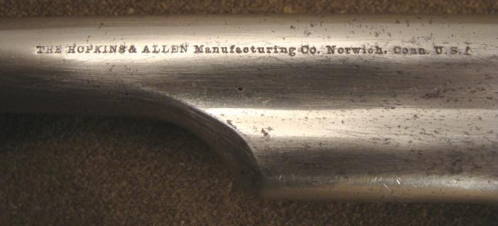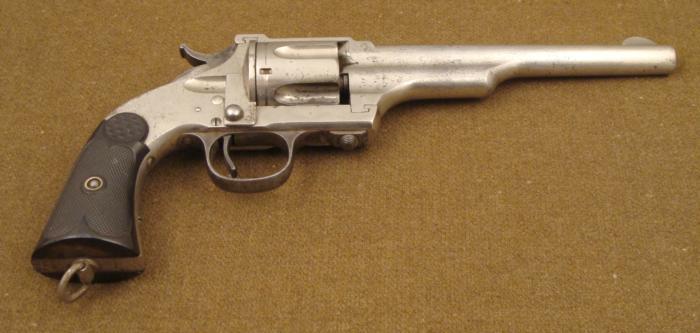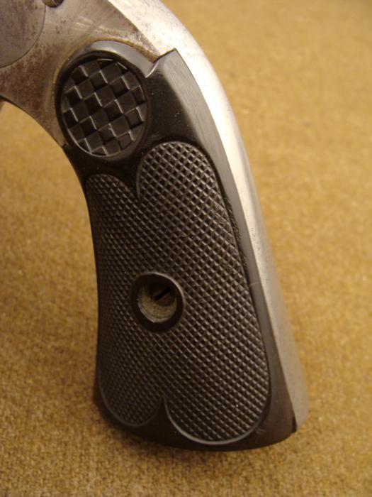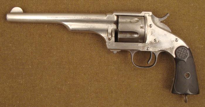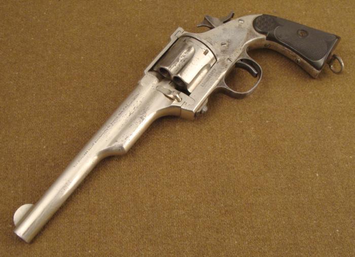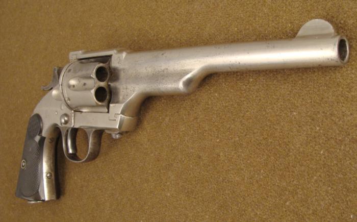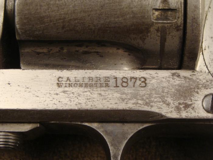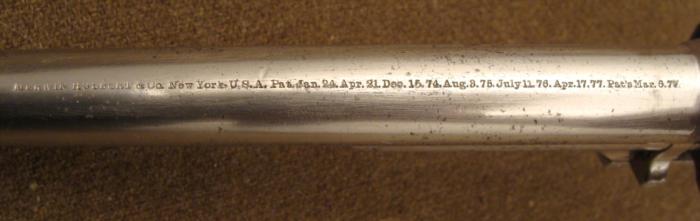 This is a Merwin Hulbert 1873 model Winchester revolver, made by the Hopkins & Allen Manufacturing Co, Norwich, Connecticut. This is a rare and desirable revolver. It features an open top scoop flute single action design. It is a .44-40 calibre, with 7 inch barrel. The overall size of this gun is 12 inches long x 5 inches tall. The exterior is nickel, and it has just been cleaned. The grips on either side are black gutta percha with checkerboard pattern, and these are original. The twist-open design is quite unusual. The name and model appear on the side. Patent dates appear on top of the barrel. The number 33 773 appears on the underside of the butt.