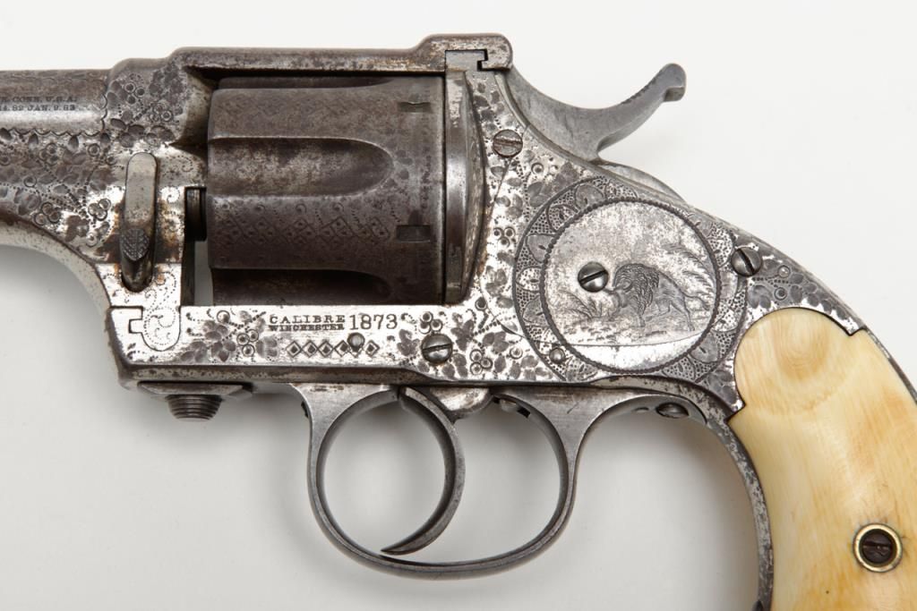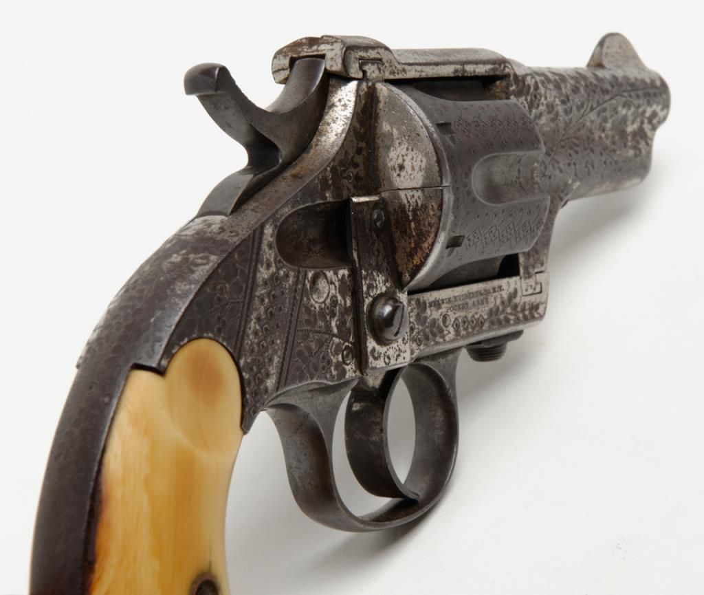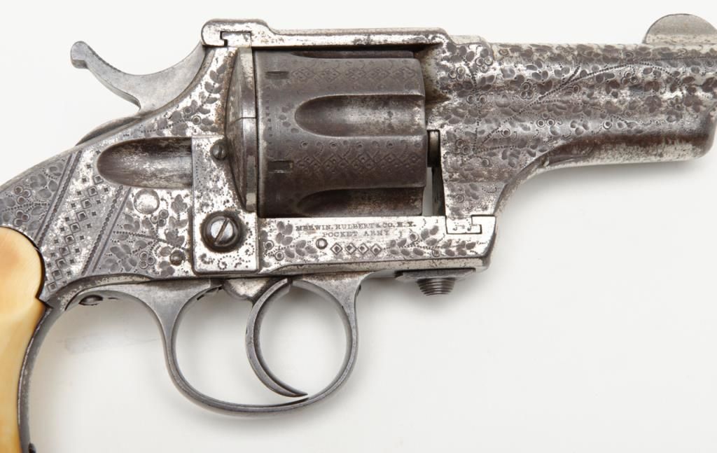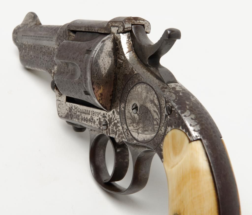 Merwin & Hulbert Third Model Pocket Army DA revolver, factory engraved with panel scene of an American Buffalo, .44-40 cal., 3-1/2” barrel, nickel finish, ivory grips, #6162. This gun is pictured in Art Phelp’s book, “The Story ofMerwin, Hulbert & Co. Firearms” on page 86. The gun is in overall very good to near fine condition showing approx. 45% original nickel with balance gone to a dark un-cleaned patina; crisp action, good bore, full coverage engraving, very goodmarkings and beautiful period ivory grips in very good to fine condition. These guns were a favorite on the Western frontier and popular today with collectors. This particular gun was one of the late Art Phelp’s favorites. (Antique). Est.: $2,800-$3,800.