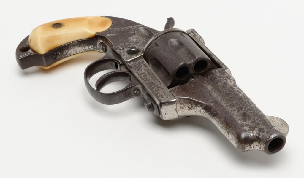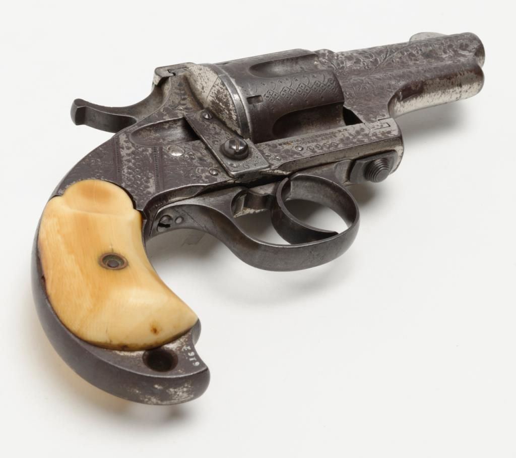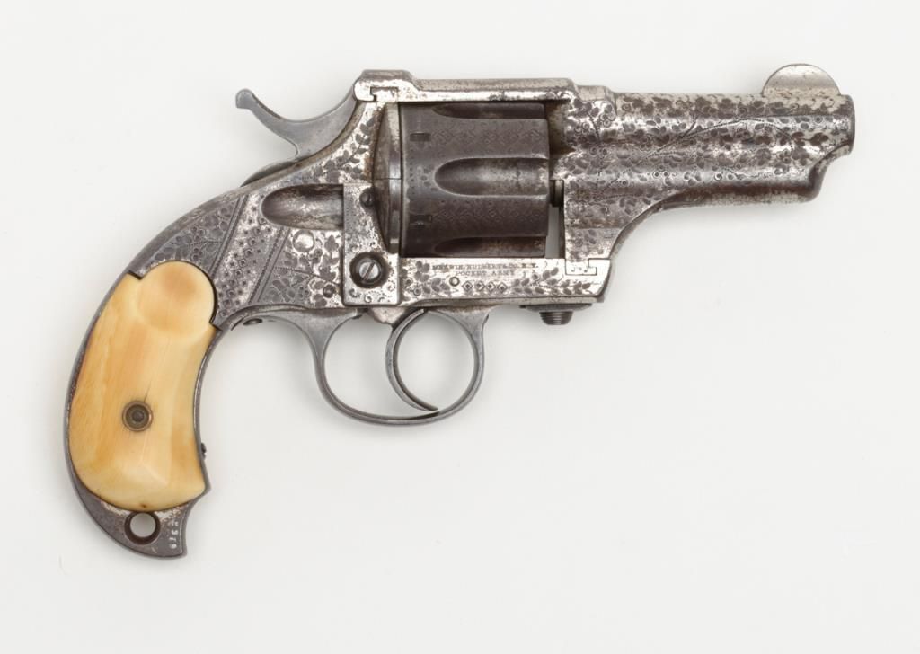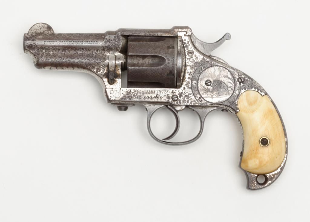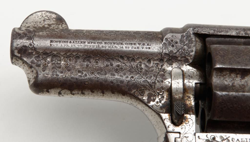 Merwin & Hulbert Third Model Pocket Army DA revolver, factory engraved with panel scene of an American Buffalo, .44-40 cal., 3-1/2” barrel, nickel finish, ivory grips, #6162. This gun is pictured in Art Phelp’s book, “The Story ofMerwin, Hulbert & Co. Firearms” on page 86. The gun is in overall very good to near fine condition showing approx. 45% original nickel with balance gone to a dark un-cleaned patina; crisp action, good bore, full coverage engraving, very goodmarkings and beautiful period ivory grips in very good to fine condition. These guns were a favorite on the Western frontier and popular today with collectors. This particular gun was one of the late Art Phelp’s favorites. (Antique). Est.: $2,800-$3,800.