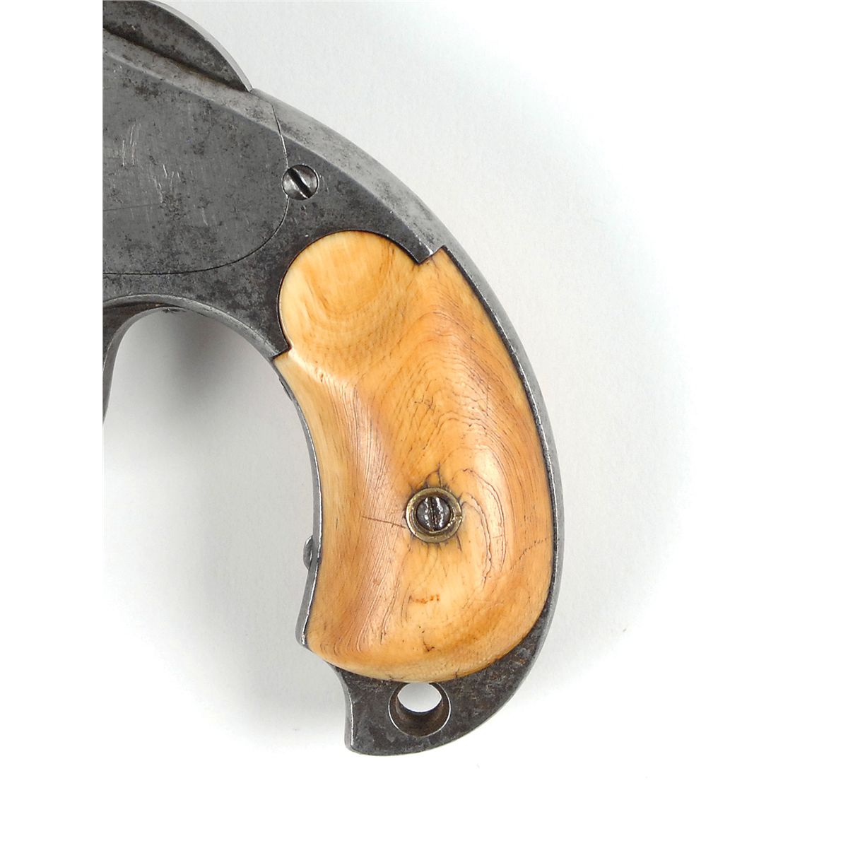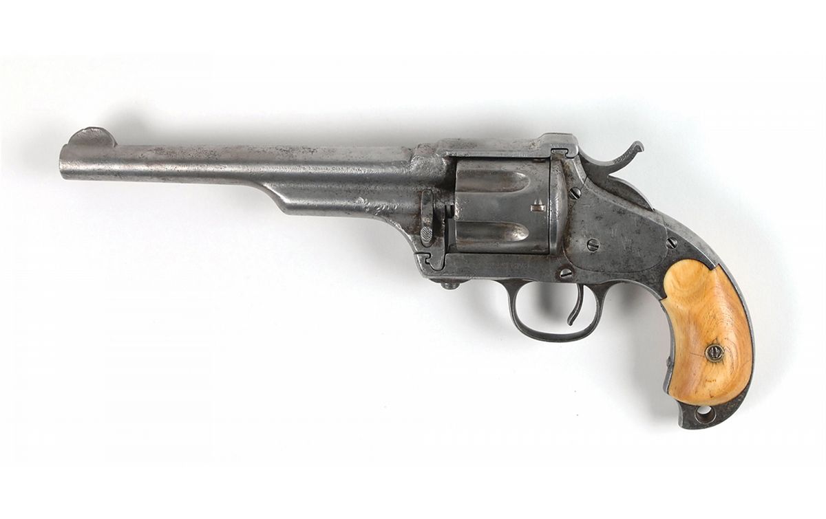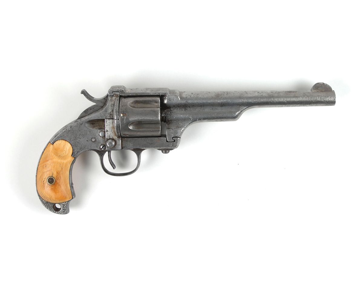 #5476, cal. .44-40 W.C.F., 7? barrel, the bore with strong rifling and patches of corrosion that may clean. The metal has matching assembly numbers, the ivory grips are numbered to each other and are believed to be original. The metal has a gray patina with only traces of the original nickel-plating. The barrel and cylinder have quite a bit of fine to light pitting. Most of its factory markings are legible and the grips rate very good with attractive age toning. The mechanism works, however the cylinder stop is worn.
