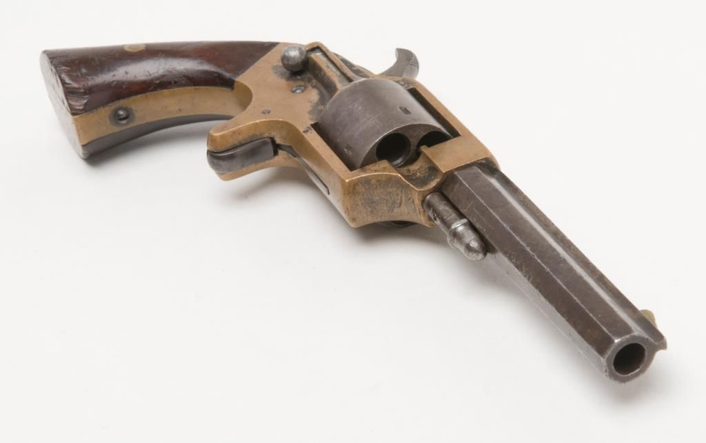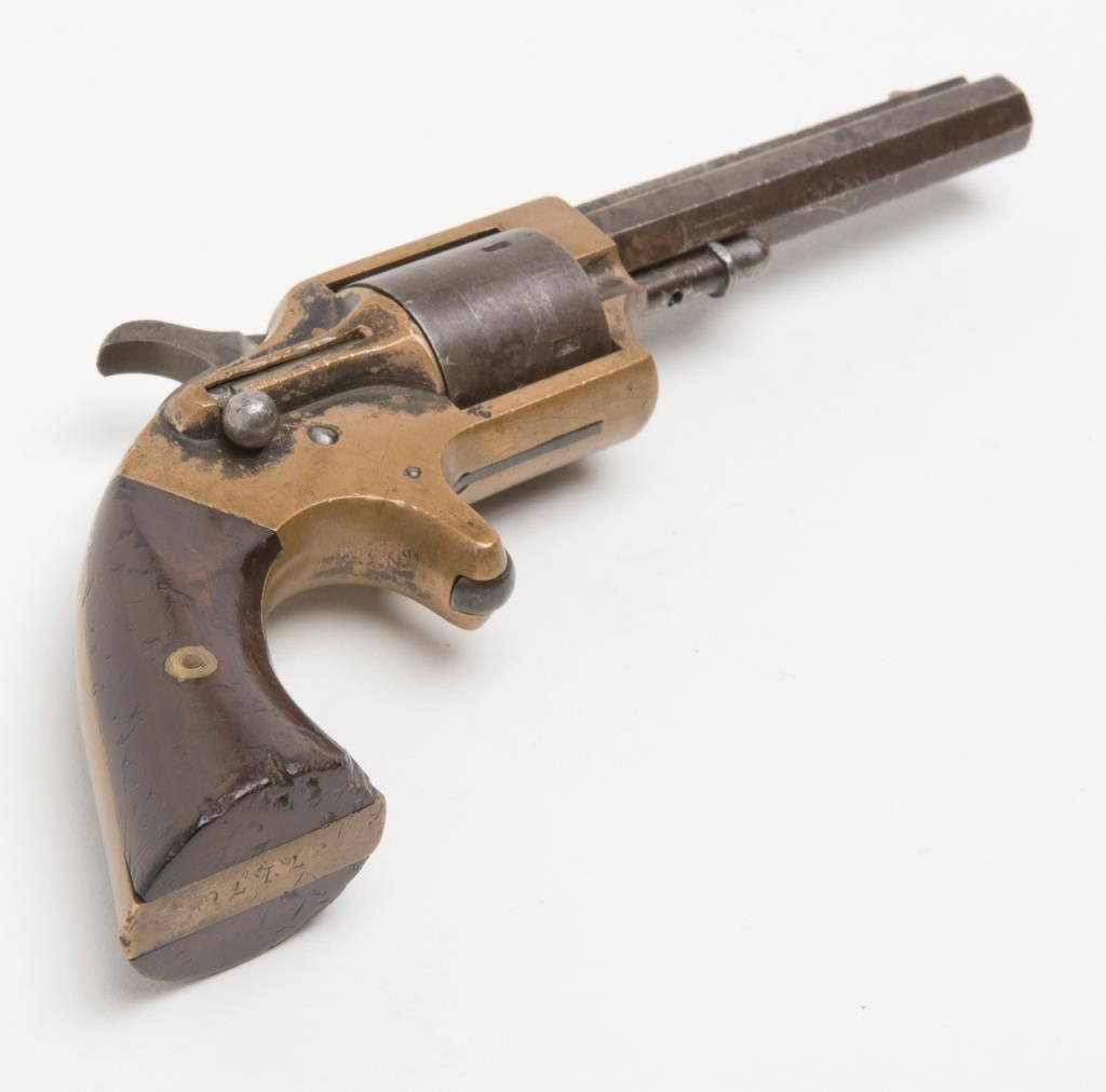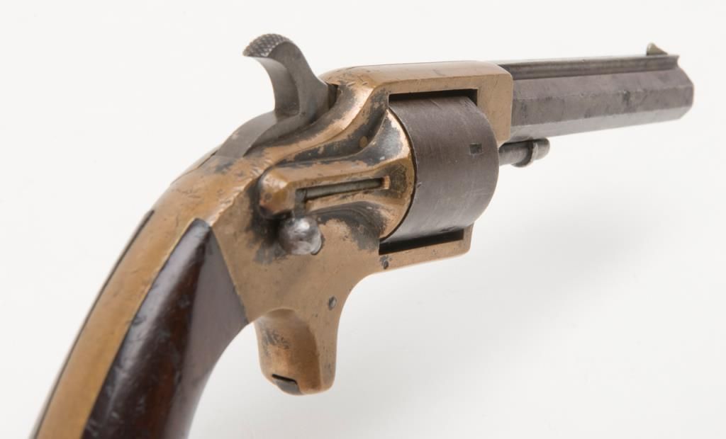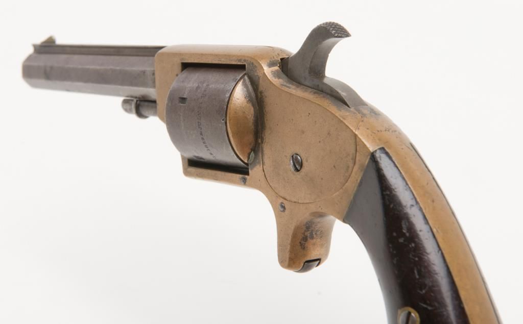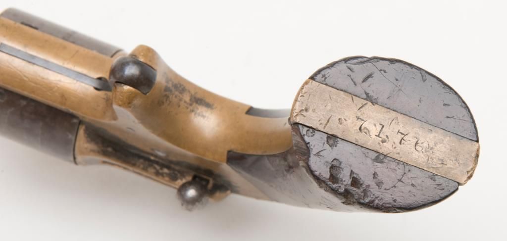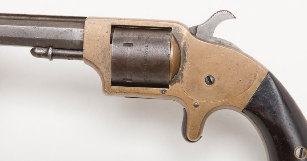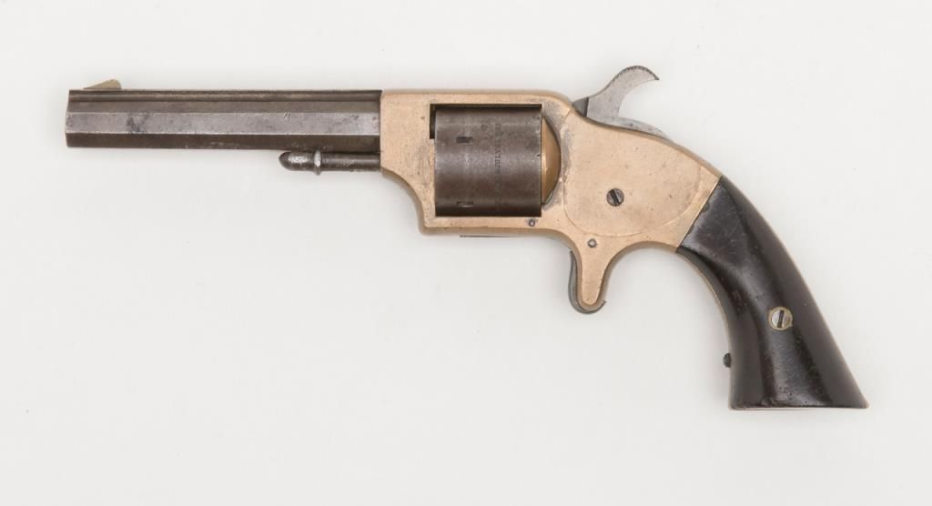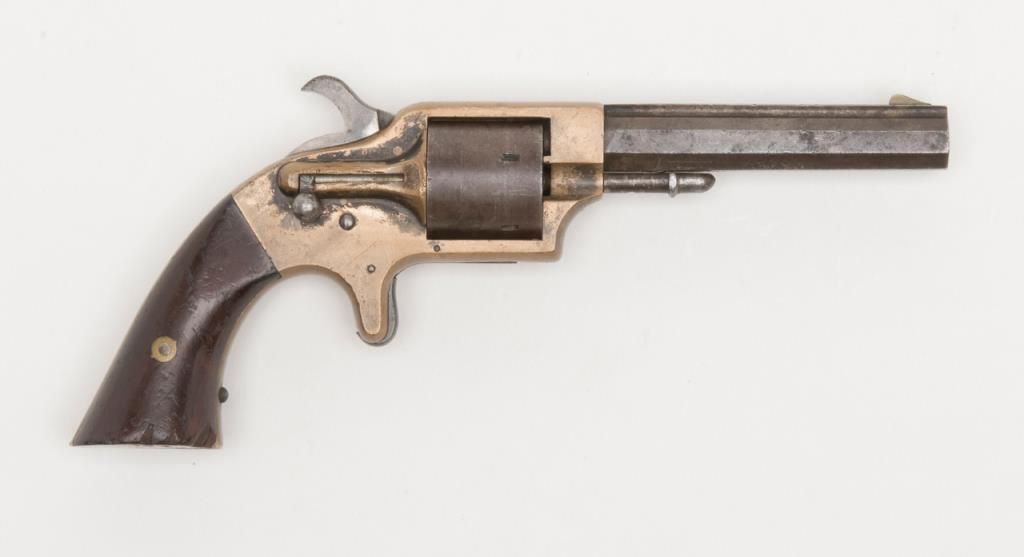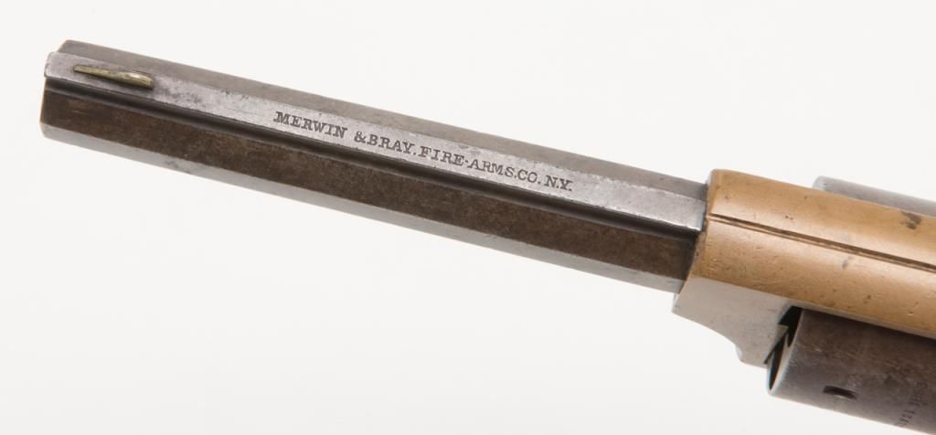 Merwin and Bray Spur Trigger revolver, approximately .28 caliber, Serial #7176. The pistol is in overall good condition with 3 ½” octagon barrel. The barrel has gone to a pleasing patina as has the cylinder. The patent dates are visible on the cylinder, as is the barrel address indicating, “MERWIN & BRAY FIRE-ARMS. CO. N.Y.”. The pistols frame has gone to brass, while the smooth wood grips have mars and chips from use. The bore is good, the action functioning and marks are sharp on this little pistol. (Antique). Est.: $150-$300.