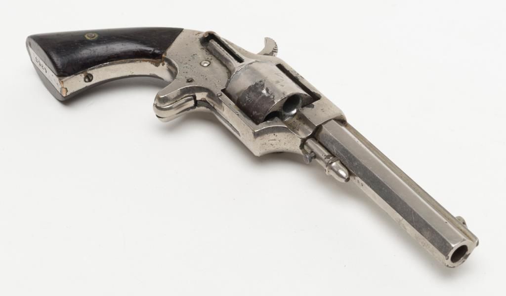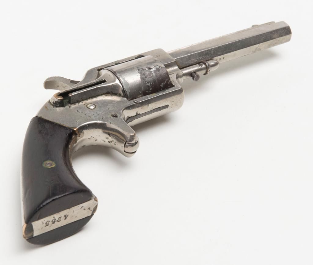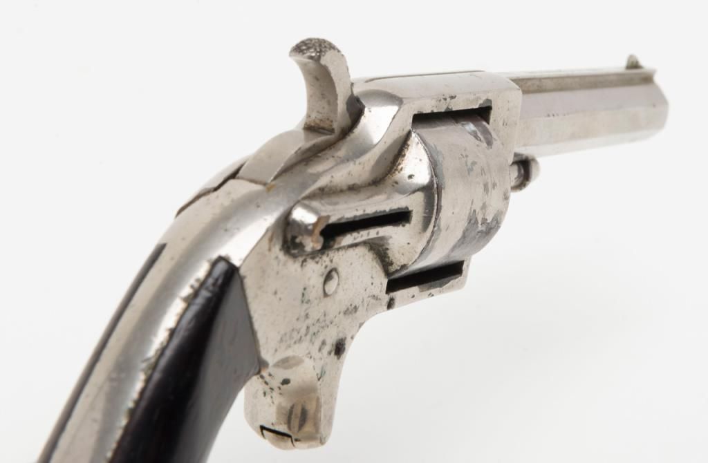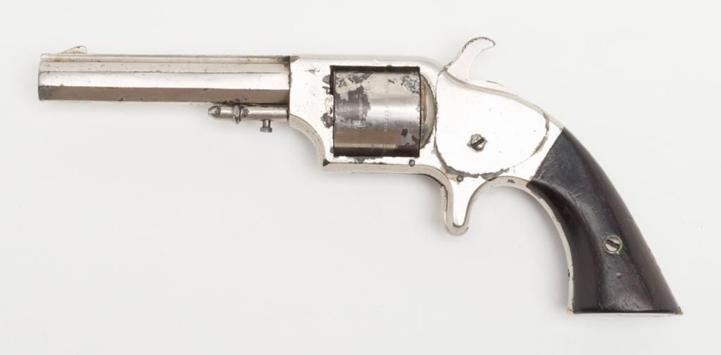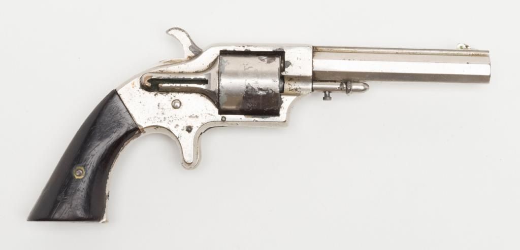 Merwin and Bray spur trigger revolver, .25 cal., 3-3/4” octagon barrel, nickel finish, wood grips, #4255 in overall good condition showing considerable nickel finish, good action, good markings and good grips; ejector rod missing.(Antique). Est.: $100-$200.