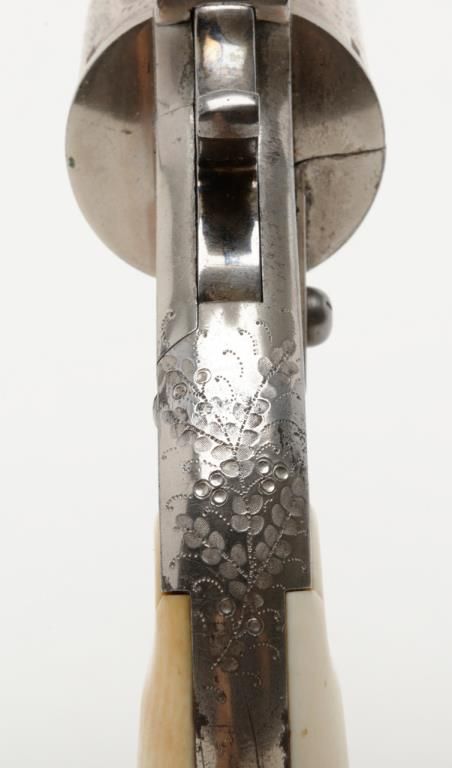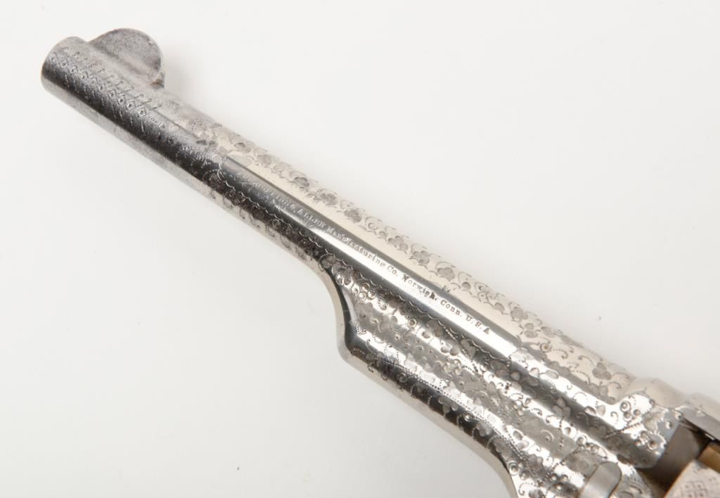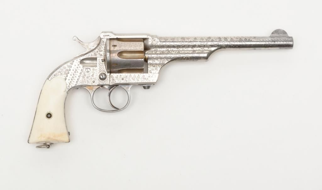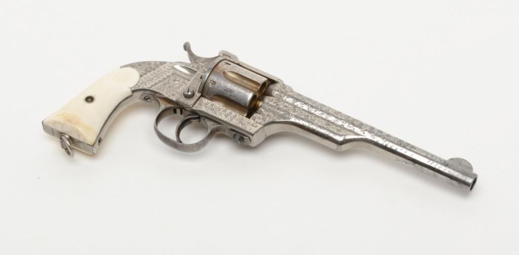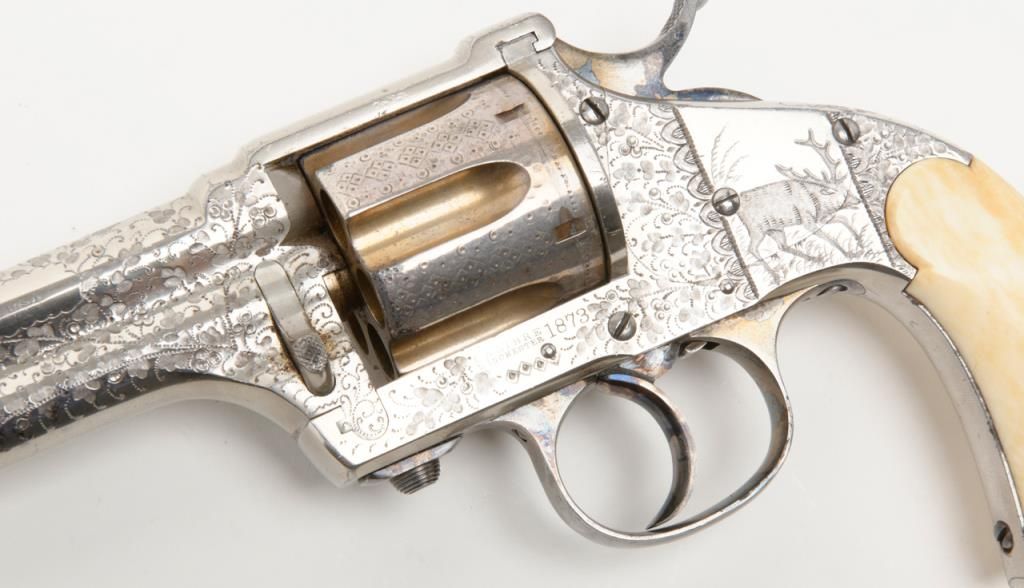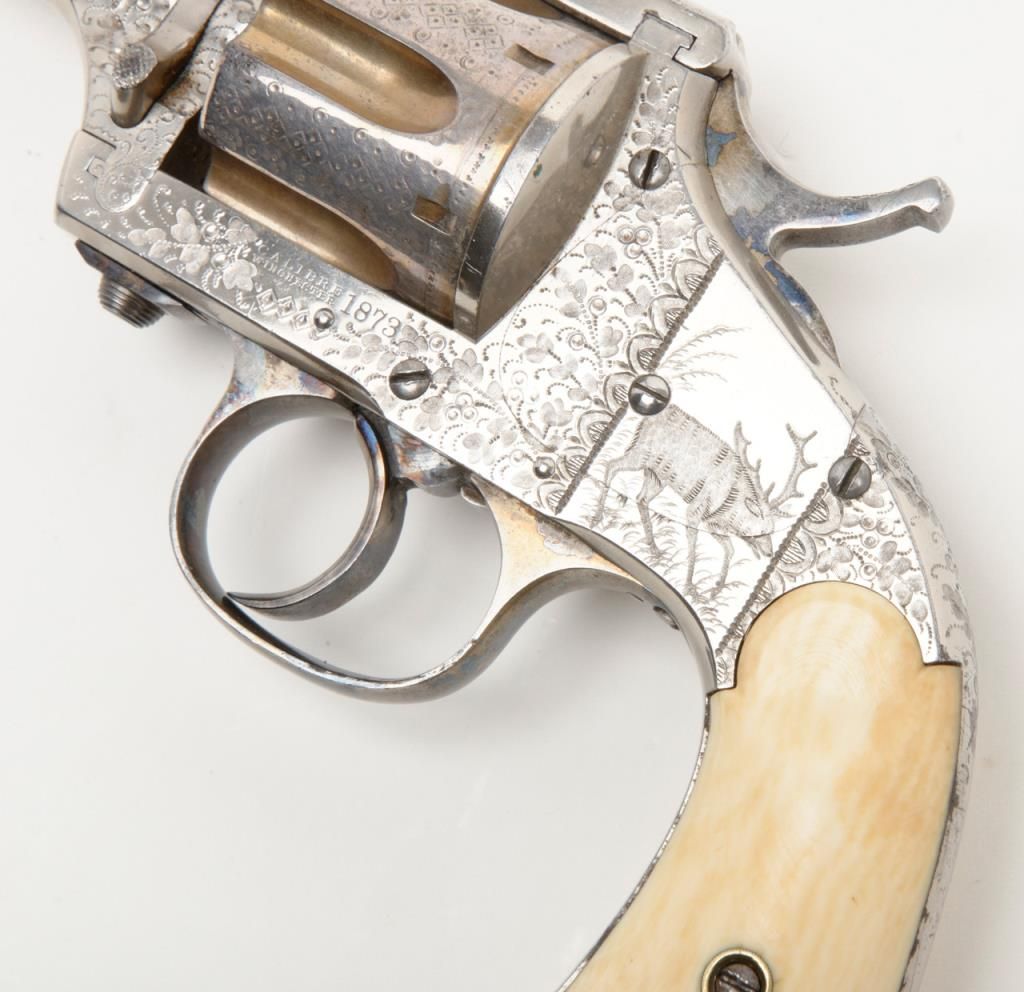 Merwin and Hulbert patent frontier revolver by Hopkins and Allen in .44-40 caliber, fully and finely engraved with panel scene of stag and fitted with original factory ivory grips, serial number 19649. This revolver was formally in thefamous Tom Weston collection located in Mexico City with his name marked beneath the grips. The revolver remains in fine to near excellent original condition showing 85% to 95% original nickel and the areas where the nickel has liftedgoing to a natural patina with some minor pitting and erosion just starting. Most of the loss is located by the front of the muzzle and on the sight. The edges are sharp and crisp and the engraving is well defined. There is an engravedsmall panel of a stag just beneath the hammer. The cylinder shows some light traces of original gold wash over the nickel plate. The grips show normal aging and fit impeccably with a couple of small chips at the left rear at the heel. The bore isvery good plus to near fine and the assembly numbers on the barrel and cylinder are 2184 and match. This revolver is a desirable and scarce configuration having a top strap over the cylinder and being double action with a squared butt. A
