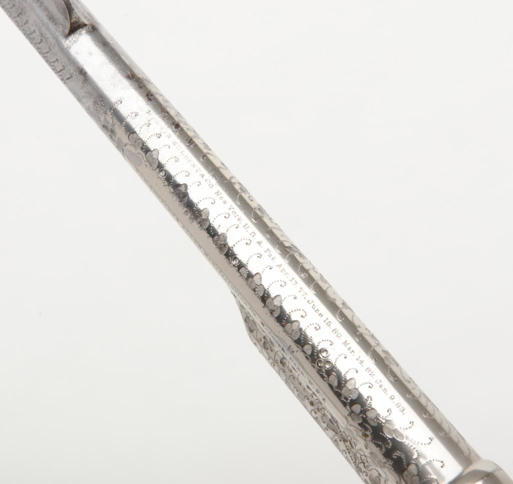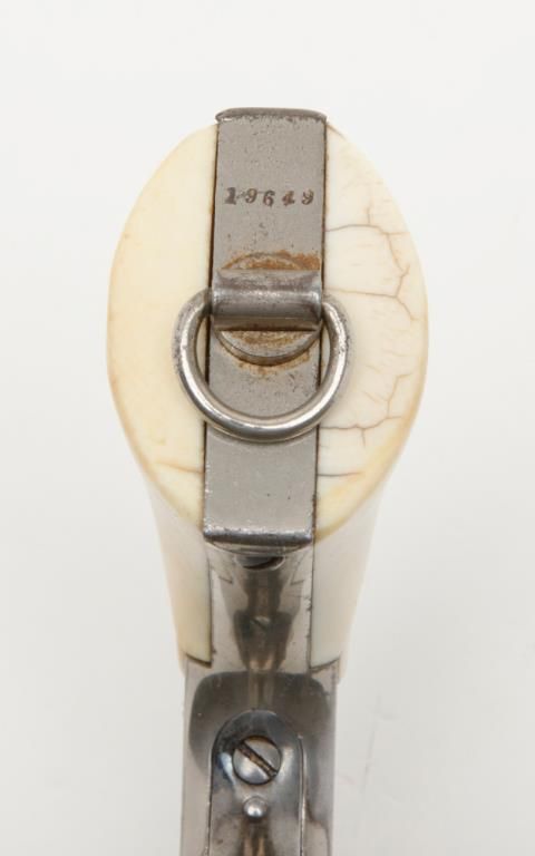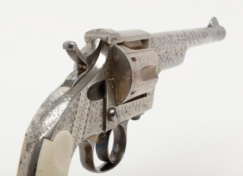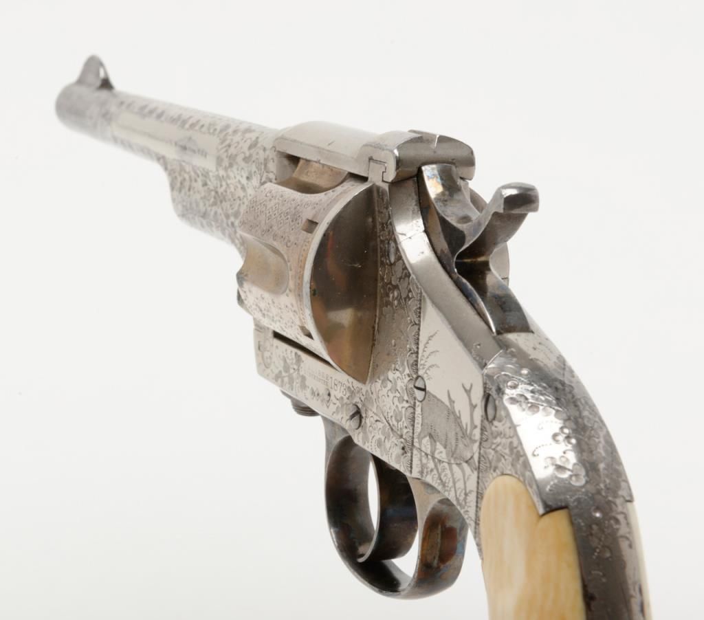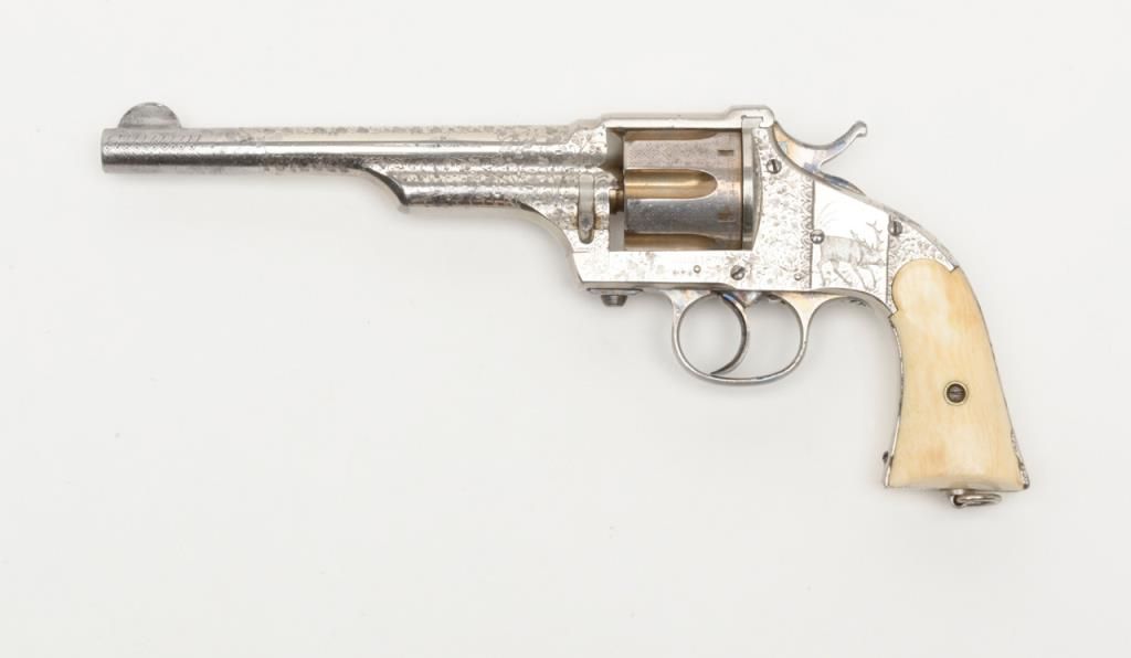Merwin and Hulbert patent frontier revolver by Hopkins and Allen in .44-40 caliber, fully and finely engraved with panel scene of stag and fitted with original factory ivory grips, serial number 19649. This revolver was formally in thefamous Tom Weston collection located in Mexico City with his name marked beneath the grips. The revolver remains in fine to near excellent original condition showing 85% to 95% original nickel and the areas where the nickel has liftedgoing to a natural patina with some minor pitting and erosion just starting. Most of the loss is located by the front of the muzzle and on the sight. The edges are sharp and crisp and the engraving is well defined. There is an engravedsmall panel of a stag just beneath the hammer. The cylinder shows some light traces of original gold wash over the nickel plate. The grips show normal aging and fit impeccably with a couple of small chips at the left rear at the heel. The bore isvery good plus to near fine and the assembly numbers on the barrel and cylinder are 2184 and match. This revolver is a desirable and scarce configuration having a top strap over the cylinder and being double action with a squared butt. A