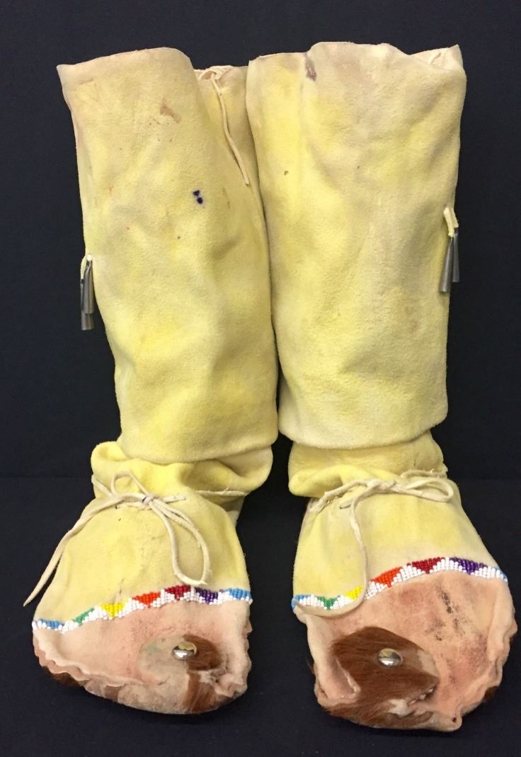 From the estate of a Mescalero lady who had her “coming-of-age” ceremony about 1960. They measure 9.5 inches long by 4.5 inches wide on the foot and the tops are approximately 12 inches high. Please look closely at pics - they are an important part of our description. Shipping: There will be a $5 handling / packaging fee for shipping this lot. The actual cost of postage will be added on top of that.
