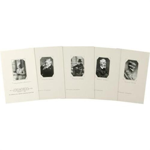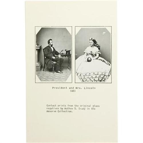 <B>Five Contact Prints Made From the Originals in the Frederick Hill Meserve Collection</B></I>. An important lot of six contact prints made from the originals in the legendary Meserve Collection. Included are four different portrait studies of Thomas Carlyle, each 2” x 3.25”, loose mounted on a folded 8.5” x 11” backing sheet with hand-written captions, fine condition. Also included are images or President and Mrs. Lincoln, each 2” x 3.25”, made from the original glass Matthew B. Brady negatives, loose mounted on the verso of a folded 8.5” x 11” backing sheet, in fine condition. A similar contact print of Frederick Hill Meserve appears on the recto with a typed caption indication that the Lincoln images were a souvenir of the meeting of the Civil War Round Table of New York, November 1, 1953. <I>Ex. Henry E. Luhrs Collection</B></I>.<BR><BR><BR><b>Shipping:</b> Flat Material, Small (<a target="_blank" href="http://www.heritageauctions.com/common/shipping.php">view shipping information</a>)