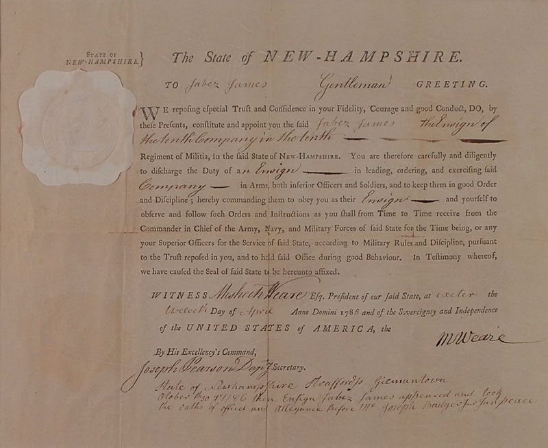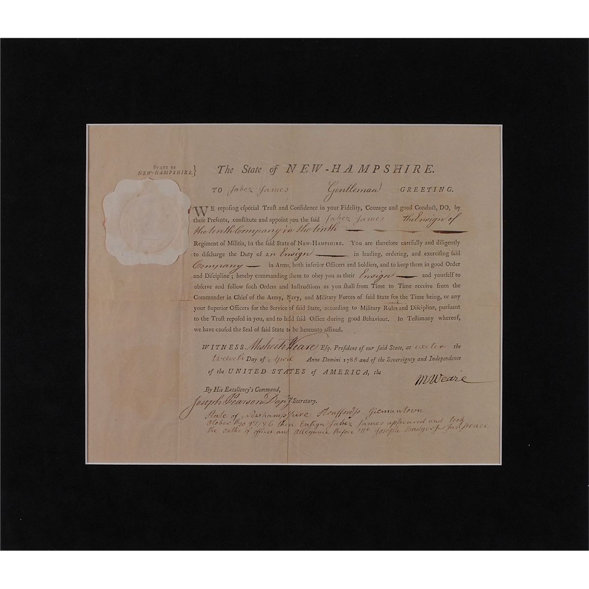American statesman (1713–1786) who served as the first president (governor) of New Hampshire. The town of Weare, where he served as the first clerk, was named in his honor. Scarce partly-printed DS, signed “M. Weare,” one page, 14 x 11.25, April 12, 1785. Weare, as president of the New Hampshire Council, appoints Faber James “Ensign of the tenth company in the tenth Regiment of Militia in the said State of New Hampshire.” Suede-matted to an overall size of 20 x 17.5. Some partial separations along intersecting folds, and a spot of toning to lower left from mirroring of seal, otherwise fine condition.
