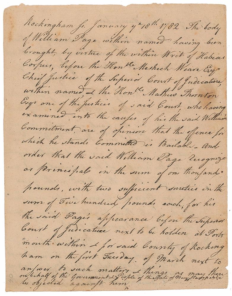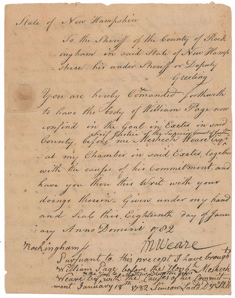 American statesman (1713–1786) who served as the first governor of New Hampshire. LS signed “M. Weare,” one page, 6 x 7.75, January 18, 1782. Letter to the sheriff of Rockingham County, New Hampshire, in part: "You are hereby commanded forthwith to have the body of William Page, now confin'd in the Goal in Exeter in said County, before me Meshech Weare Esq'r, chief Justice in the Superior Court…at my Chamber." The bottom is endorsed by Deputy Sheriff Simeon Ladd, stating that he brought Page before the Hon. Weare on the same day. On the reverse, an anonymous court commentator notes that the prisoner's bail was set by "the Hon'ble Mathew Thornton," who had signed the Declaration of Independence six years earlier. In fine condition.