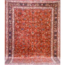 Red ground with palmette and trellising vine field within a palmette and trellising vine guard border on blue ground.