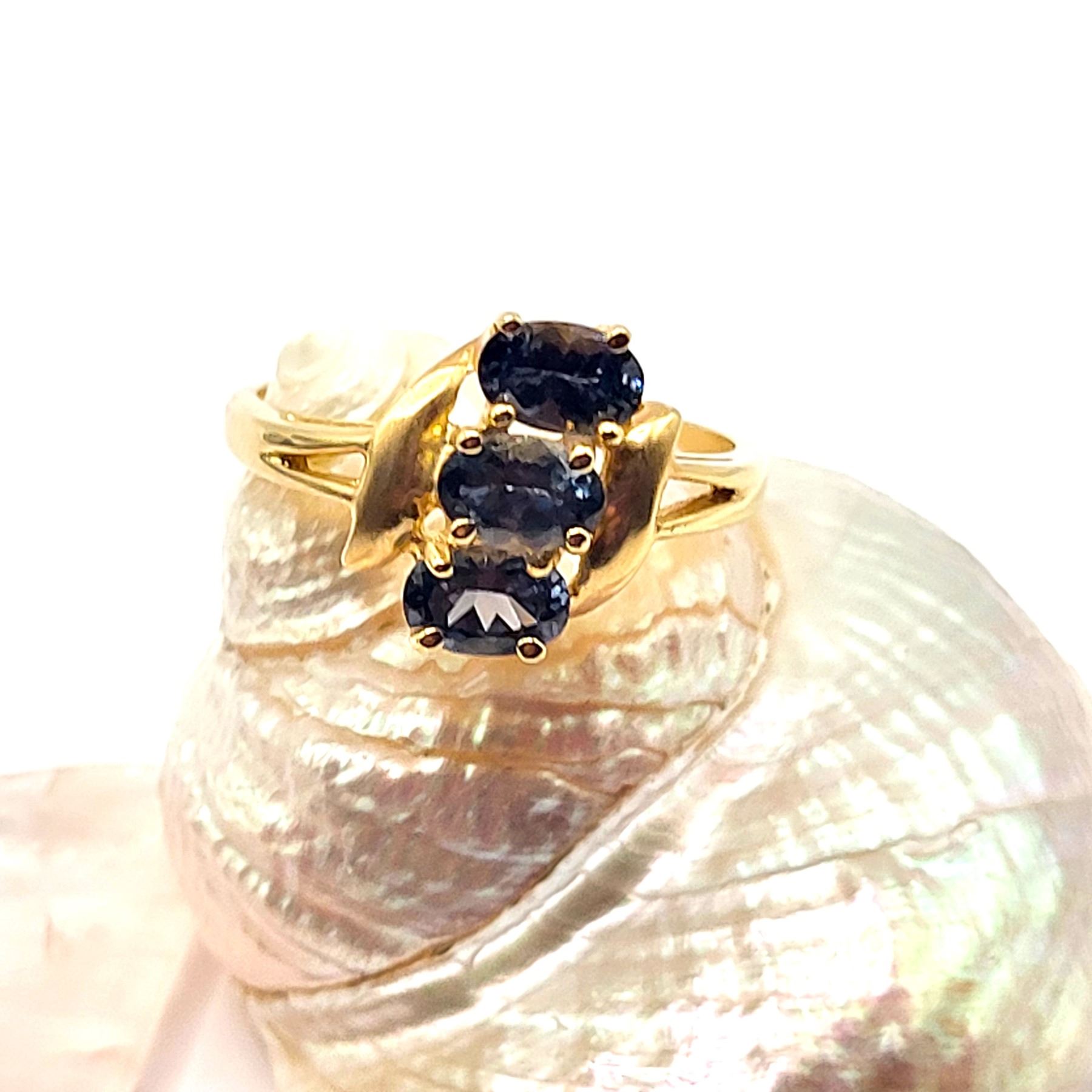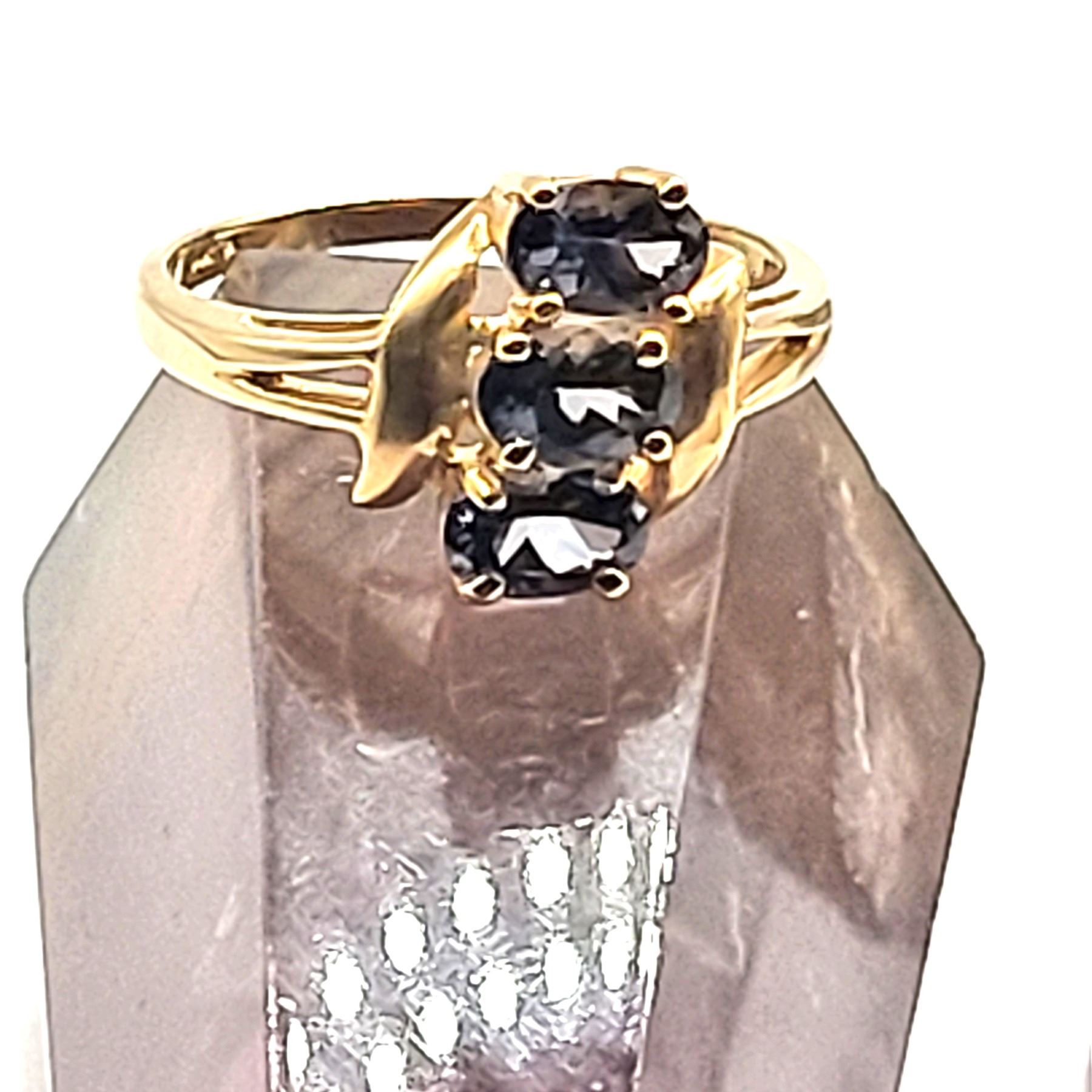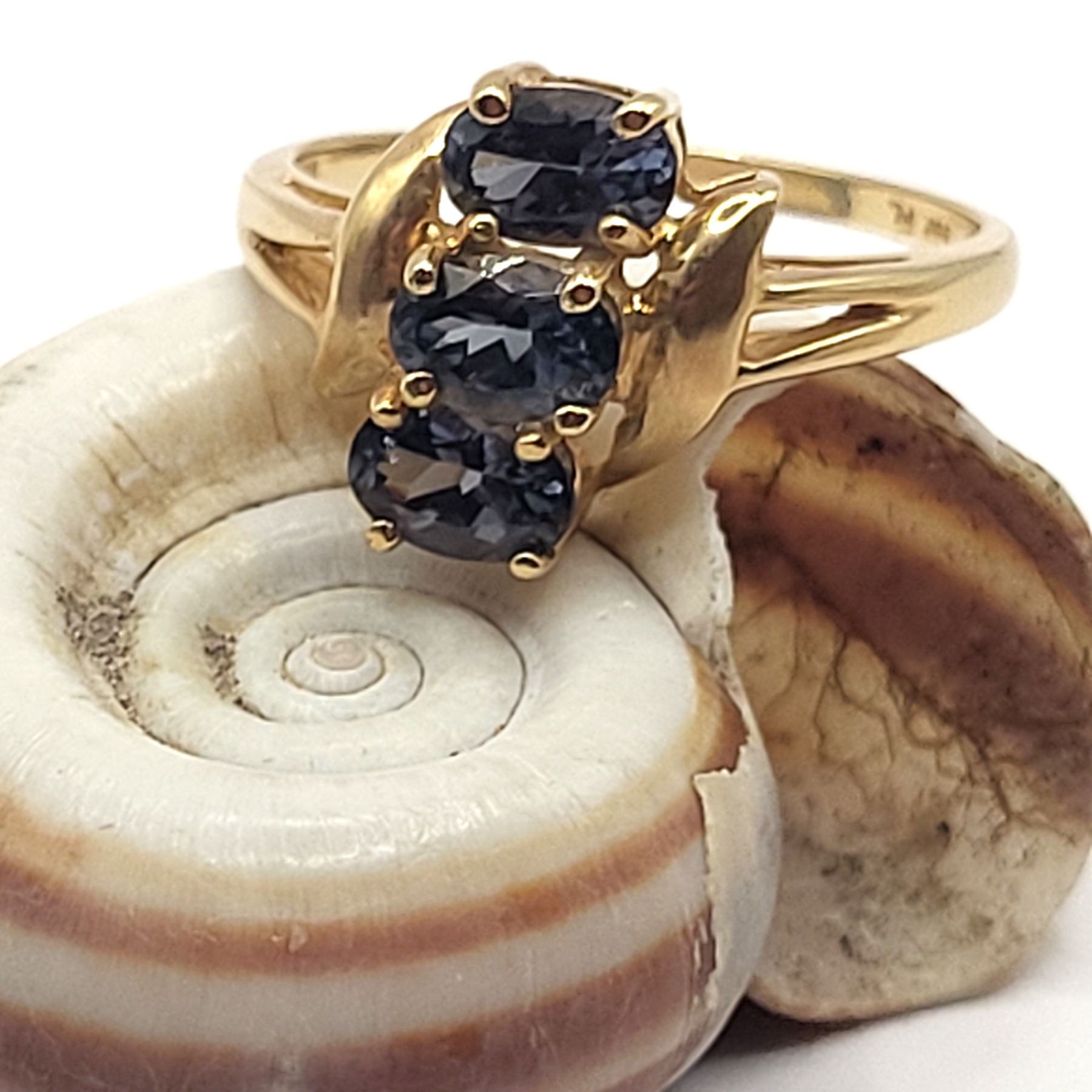 This 14 karat yellow gold ring features the beauty of the purple spinel, a gemstone not seen in commercial, retail jewelry stores. Three oval-cut, genuine purple spinels equal approximately 1.50 carats total weight and can beautifully represent your past, present, and future.& nbsp; Or it is a gift for a 22nd wedding anniversary.& nbsp; This ring is US size 9 and can be sized for an additional charge. Please contact Bidfair Fine Jewelry for sizing details.& nbsp; Admin: 33110/11bei& nbsp;