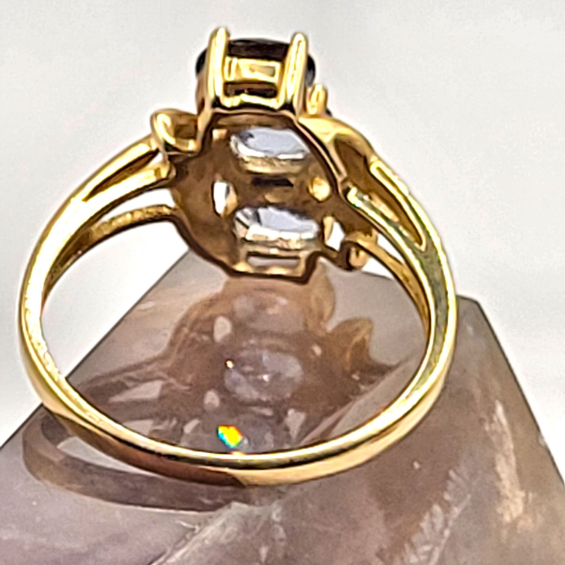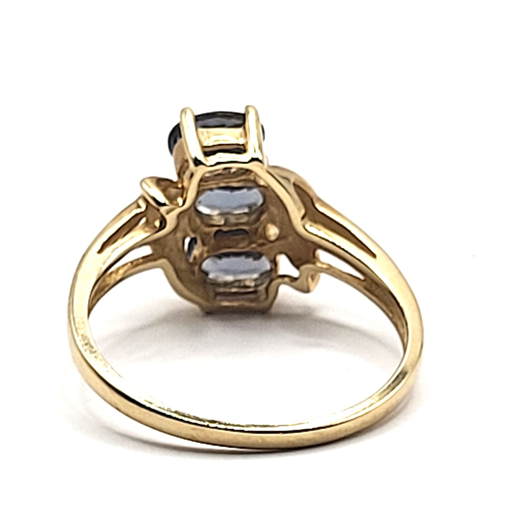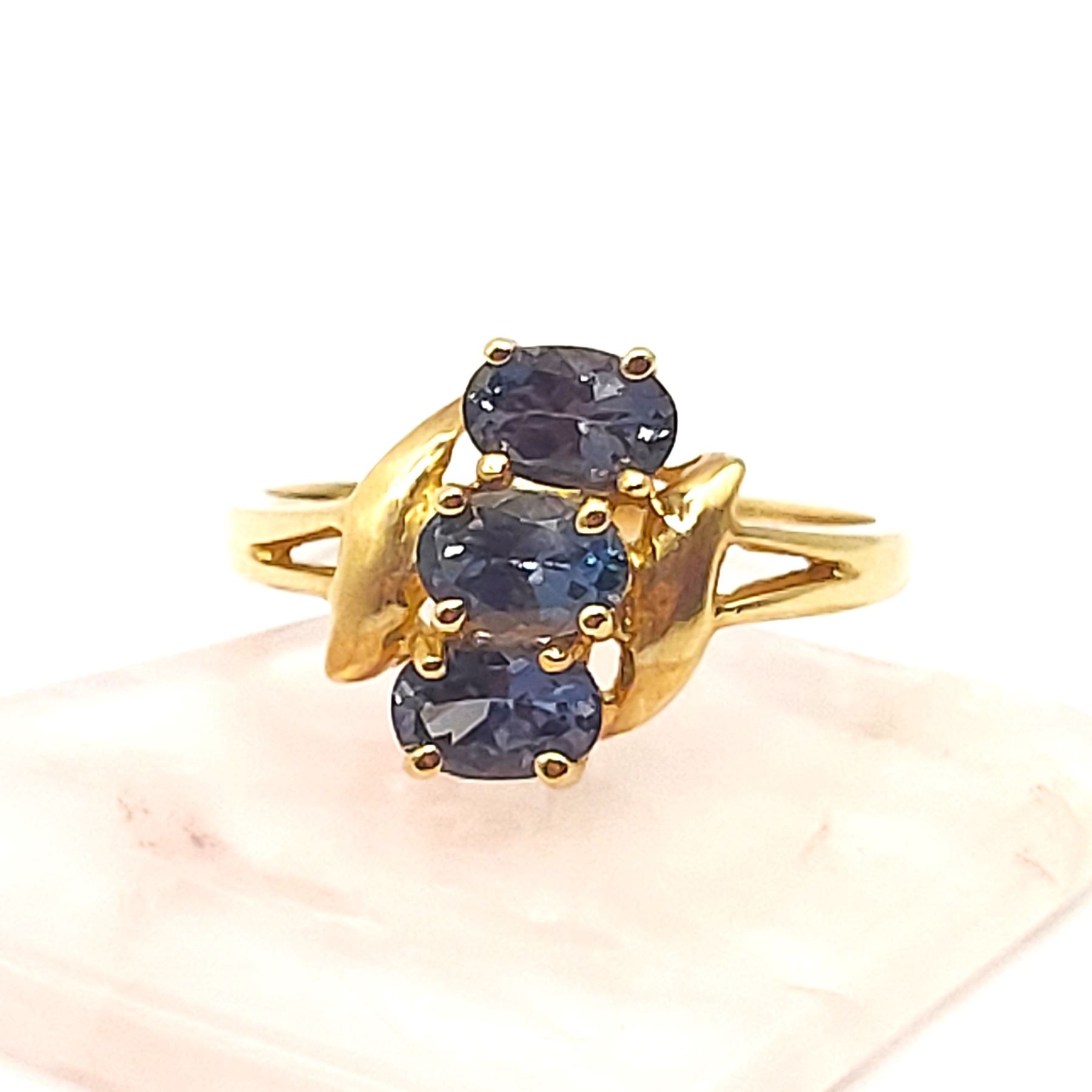 This 14 karat yellow gold ring features the beauty of the purple spinel, a gemstone not seen in commercial, retail jewelry stores. Three oval-cut, genuine purple spinels equal approximately 1.50 carats total weight and can beautifully represent your past, present, and future.& nbsp; Or it is a gift for a 22nd wedding anniversary.& nbsp; This ring is US size 9 and can be sized for an additional charge. Please contact Bidfair Fine Jewelry for sizing details.& nbsp; Admin: 33110/11bei& nbsp;