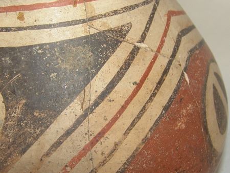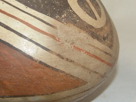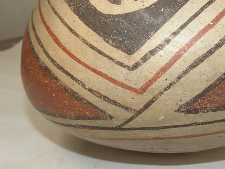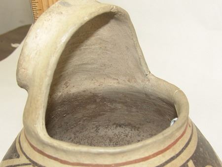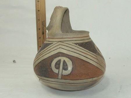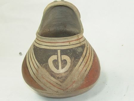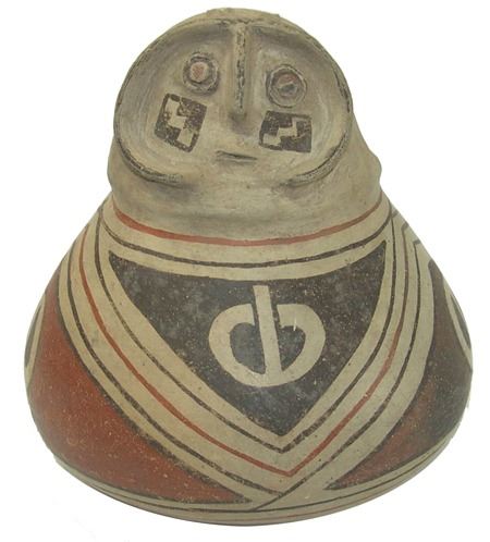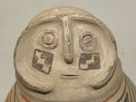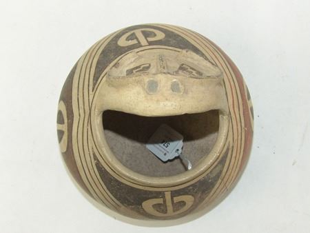 Prehistoric, Rare Casas Grandes Villa Ahumada(?) polychrome effigy pot with raised human head at the rim. Very good, as-found condition, has one glued area. *The Lots 671-680 & 121-130 in this auction come from a prominent private Seattle collection. The owner is knowledgeable and confident in his descriptions and the ages of the pieces.* 9" x 8"