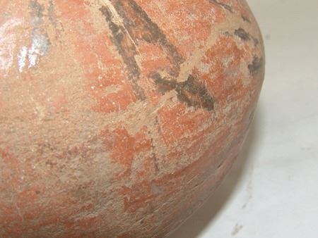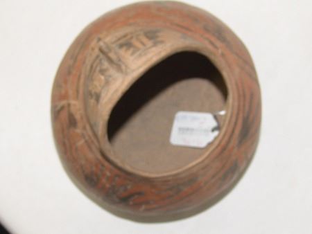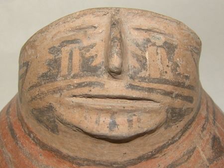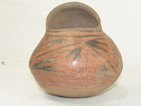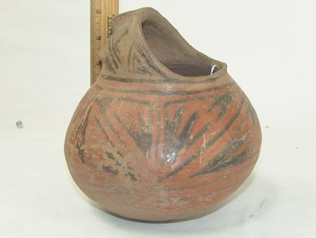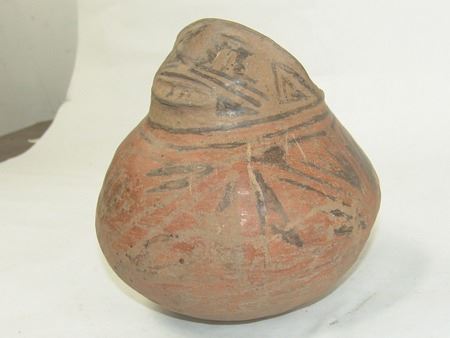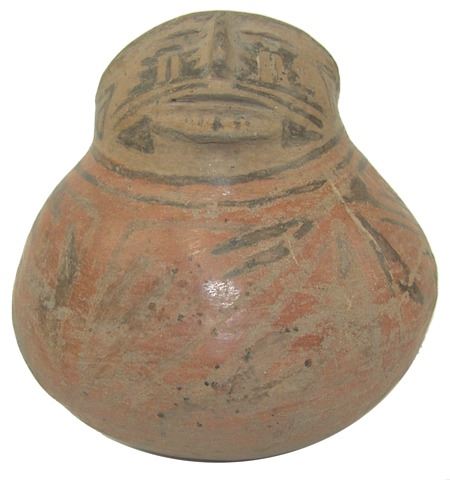 Prehistoric, Rare Casas Grandes polychrome effigy pot, the body done in black and red, the raised human head detailed in black. Very good, as-found condition. *The Lots 671-680 & 121-130 in this auction come from a prominent private Seattle collection. The owner is knowledgeable and confident in his descriptions and the ages of the pieces.* 7-1/2" x 7-1/2"