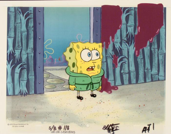 This animation cel and reproduction background are from the Nickelodeon TV show SpongeBob Squarepants. The story takes place under the deep blue sea in Bikini Bottom, where SpongeBob resides. SpongeBob, who is a yellow, porous sponge, is your typical happy-go-lucky character, as he is always cheerful and enjoys making people laugh. Patrick Star, SpongeBob's neighbor who is a starfish, is your average children's show idiot, as he boasts knowing nothing and is often getting himself into ridiculous situations. Between the homes of these two lies the home of the miserable Squidward, a squid, who is known for being grouchy and playing tricks on SpongeBob and Patrick. Both SpongeBob and Squidward work at the Krusty Krab, a fast food business run by the greedy money-loving Mr. Krabs, a crab, the arch rival of the evil, possibly misunderstood, Plankton. Another neighbor, Sandy Cheeks, an athletic squirrel who normally wears an astronaut's space suit, was introduced in "Tea at the Treedome." She spends most of her time inventing and experimenting. SpongeBob is shocked to see the mess in his house.Original Printed Background and Animated Cel Overall Size of Background: 11" x 17" Overall Size of the Cel: 10 1/2" x 12 1/2" Very good condition This is an original hand-painted cel set-up used in the production of an episode of "SpongeBob SquarePants." Each one-of-a-kind set-up represents a slight change in position of the characters. When individually photographed and projected in rapid succession, the images appear to move.