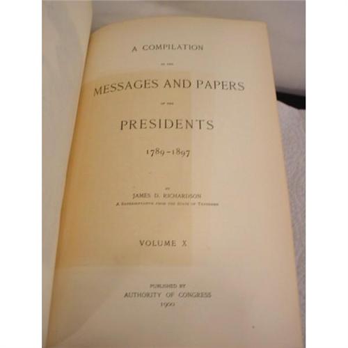 10 volumes of messages and papers of the presidents 1789-1898 by James D. Richardson published by autority of congress 1900 the bindings are a little worse for ware over the last 107 years but the pages are in very good condition with very good engravings of the presedents many from originals in the white house.each book is 6-1/2 " x 10" 2" apox 3Lb.[285]