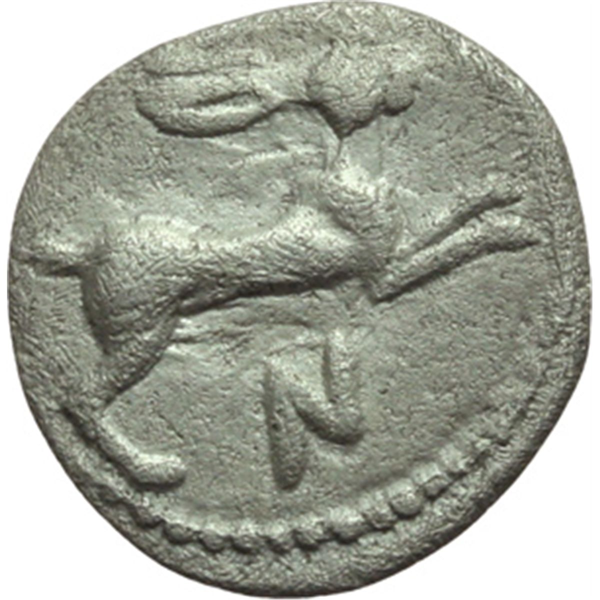 Mondo Greco. Sicilia. Messana. Litra, 461-396 a.C. D/ Lepre che corre a destra. Sotto, N. R/ MEΣ entro corona d'ulivo. SNG Cop. 410. AG. g. 0.65 mm. 11.00 qSPL.