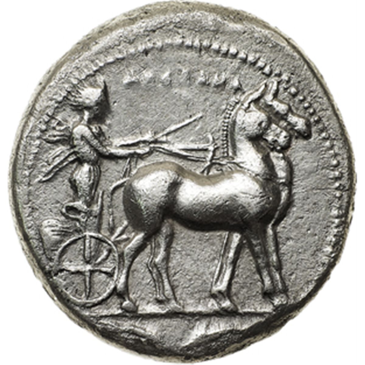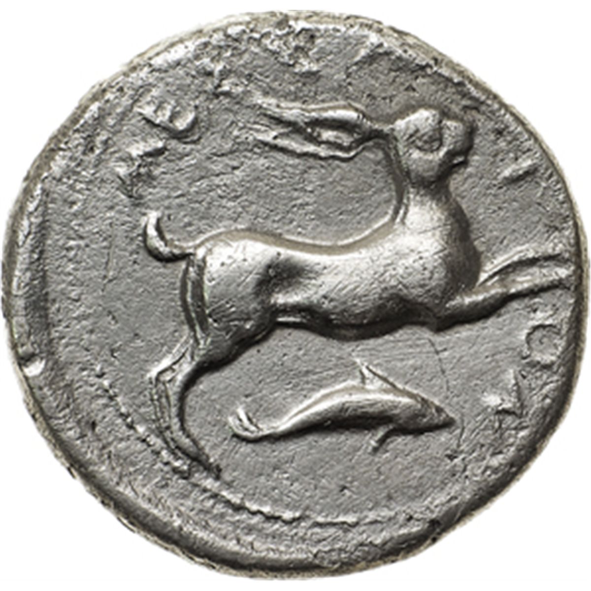 Mondo Greco. Sicilia. Messana. Tetradracma, 450-425 a.C. D/ MEΣΣANA. Biga trainata da mule a destra, condotta dalla ninfa Messana. In esergo, due delfini. R/ MEΣΣΑNION. Lepre che corre a destra. Sotto, delfino a destra. Cfr. SNG Cop.400 var. e SNG ANS 362 var. AG. g. 16.69 mm. 26.00 R. qSPL.