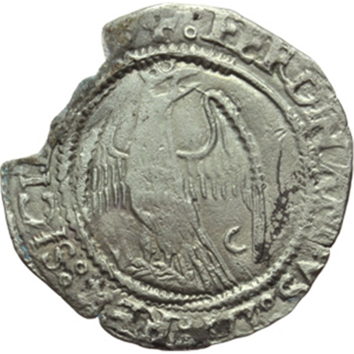 Monete e Medaglie di Zecche Italiane. Messina. Ferdinando il Cattolico (1479-1516). Tarv¨, con sigla MC. Sp. 144. MIR 245/2. AG. g. 2.77 Mancanza di un pezzo del tondello. BB.