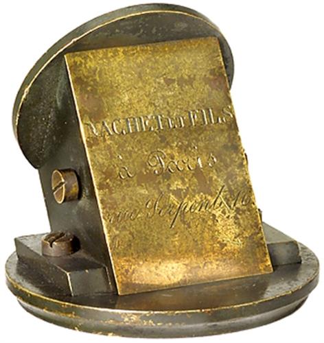 Messing-Mikroskop und Zubehör vo "Nachet et Fils, Paris" € 350,- Unbezeichnetes Mikroskop auf Kippstativ und Hufeisenfuß. Höhe ca. 33 cm. 3-fach-Objektivrevolver mit 2 Messingobjektiven. Mit Umlenkprisma "Nachet et Fils à Paris" und weiteren Zubehörteilen in Holzkasten. Brass Microscope and Accessory by "Nachet et Fils, Paris" Unmarked microscope on tilting limb and horseshoe base. Height 13 in. Nosepiece with 3 objectives (2 brass). With reflecting prism by "Nachet et Fils" and other accessories in wooden box. – (3/3) – € 400/700 – (22/43)