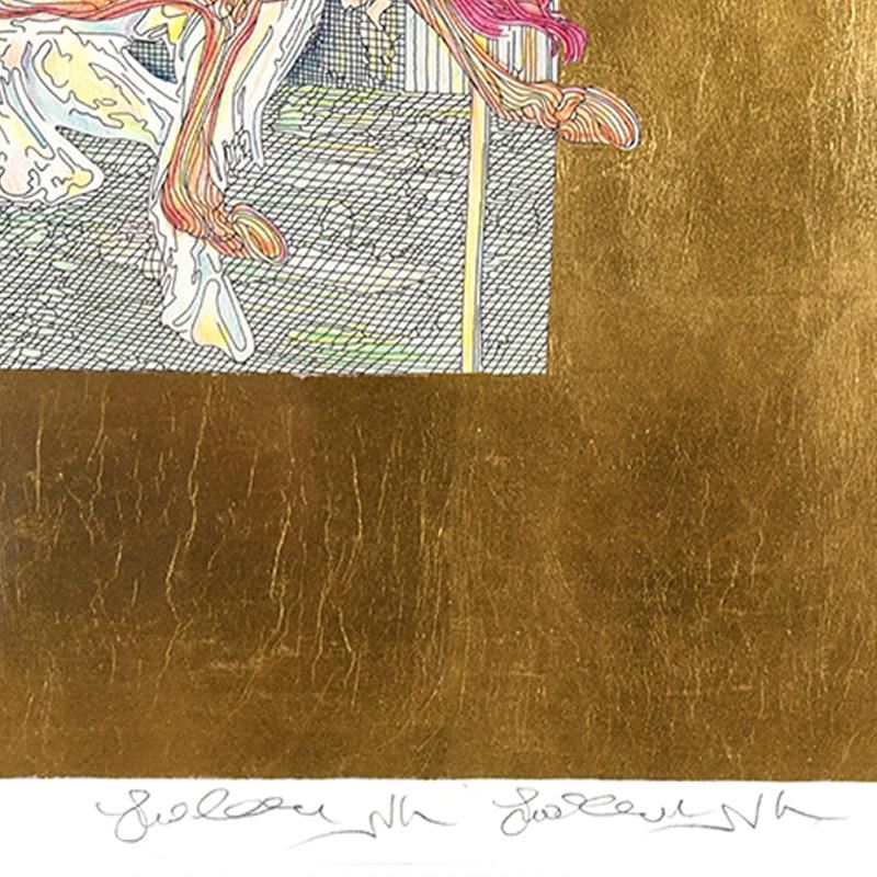 "Mesteno, Esai" is a one-of-a-kind hand colored mixed media on paper with goldleaf by Guillaume Azoulay, numbered 1/1 and hand signed by the artist. This piece comes custom framed. Includes Letter of Authenticity. Measures approx. 32" x 30" (frame), 20" x 18" (image).