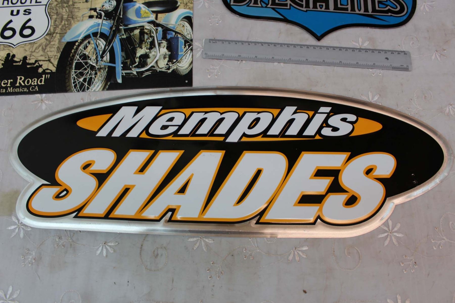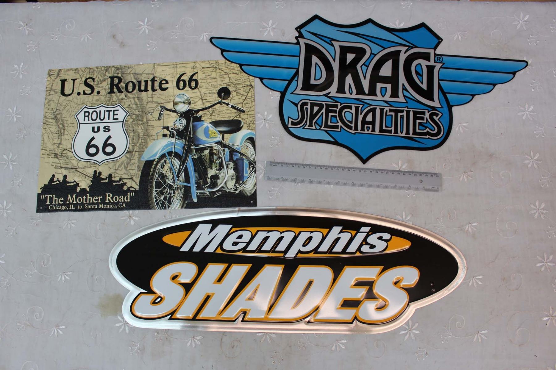 Metal Advertising Signs (3) (Route 66, Memphis Shades, Drag Specialties)