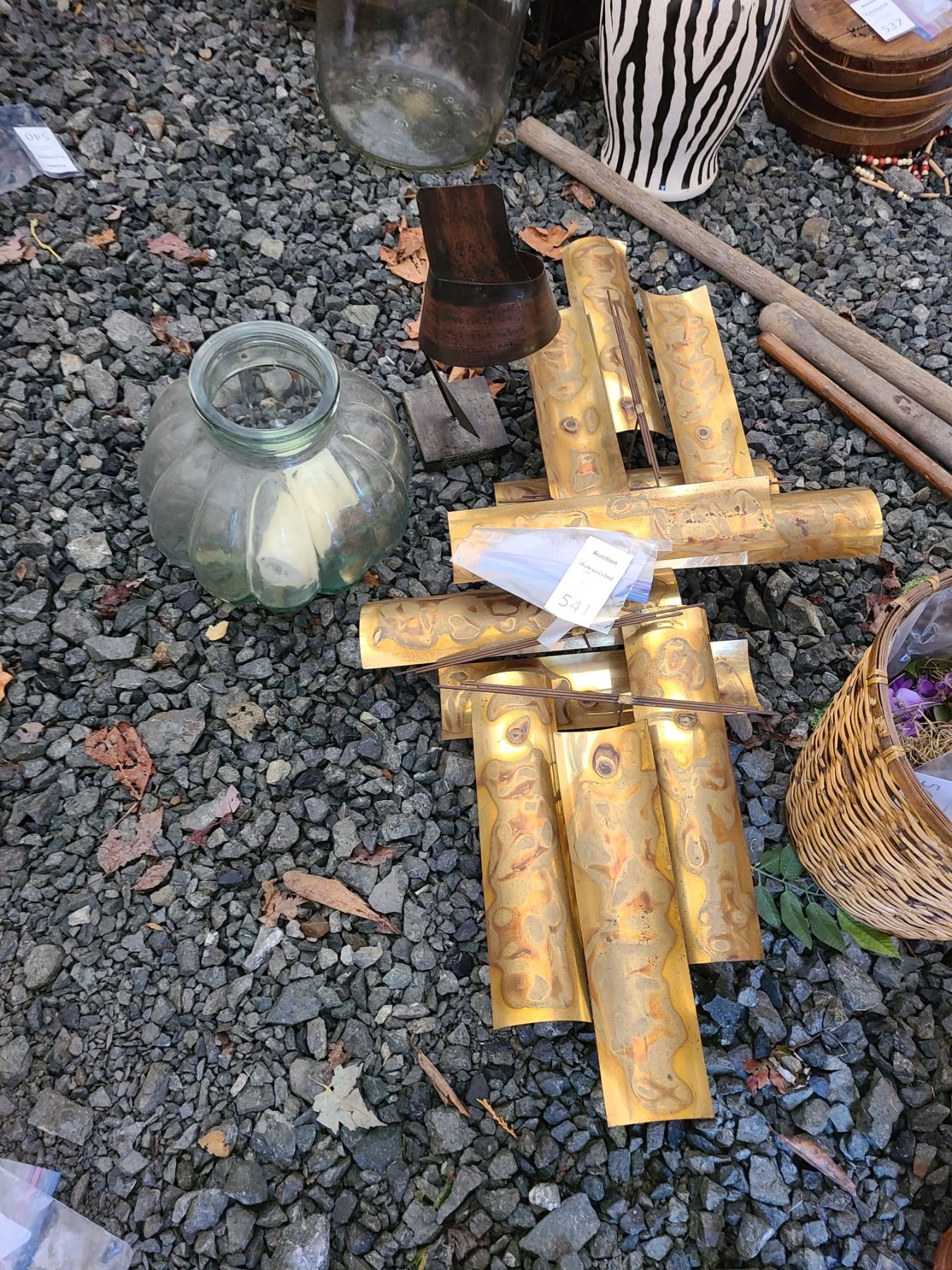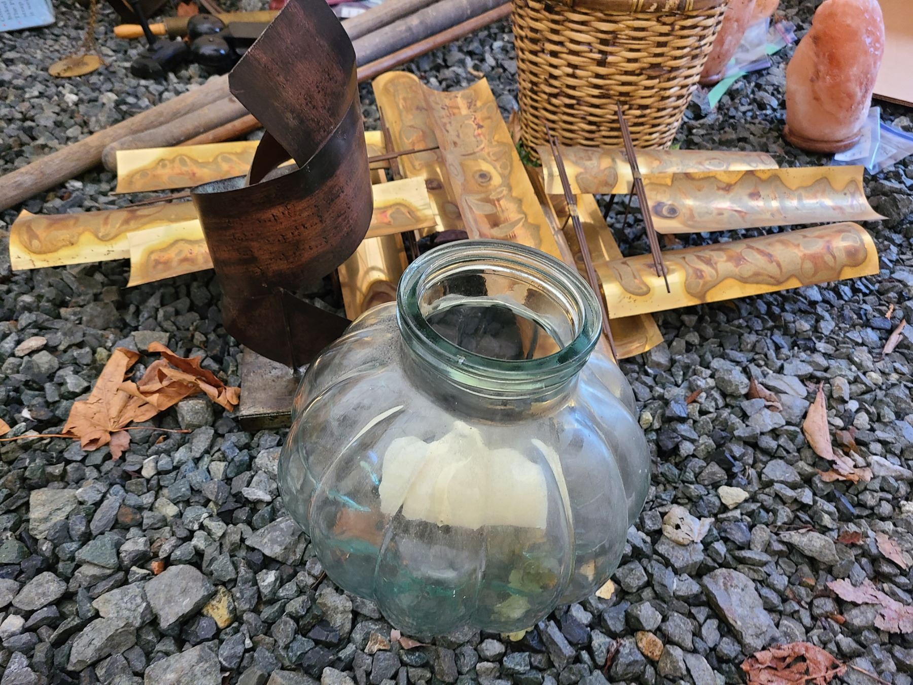 Large metal art piece, small art piece, and large glass bowl with candle. Pickup at 9 am.