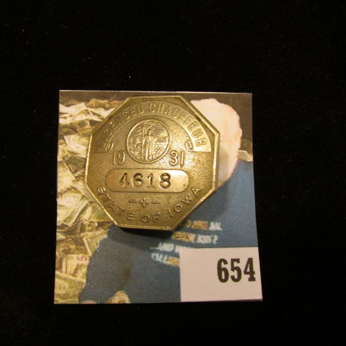Metal Badge "Licensed Chauffeur 1931 4618 State of Iowa".