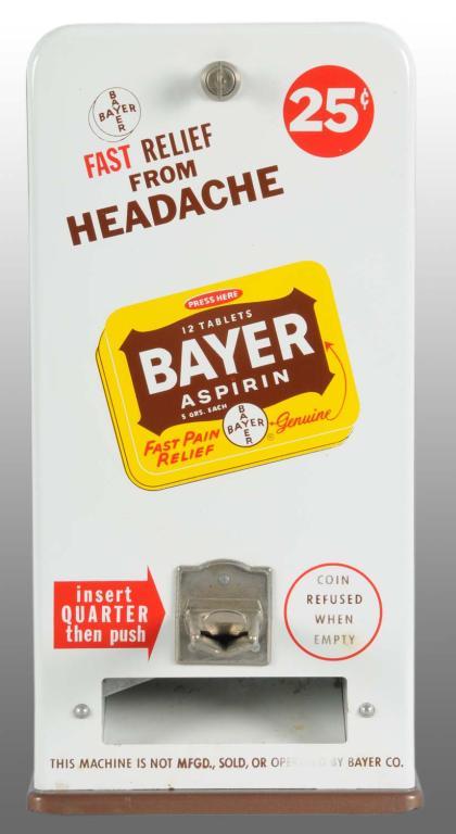 Twenty-five cent vending machine with 15 Bayer Aspirin Tins. Minor paint loss on bottom. Key is included. Condition (9.0, Near Mint). Size 17 - 1/2" x 8 - 1/2".