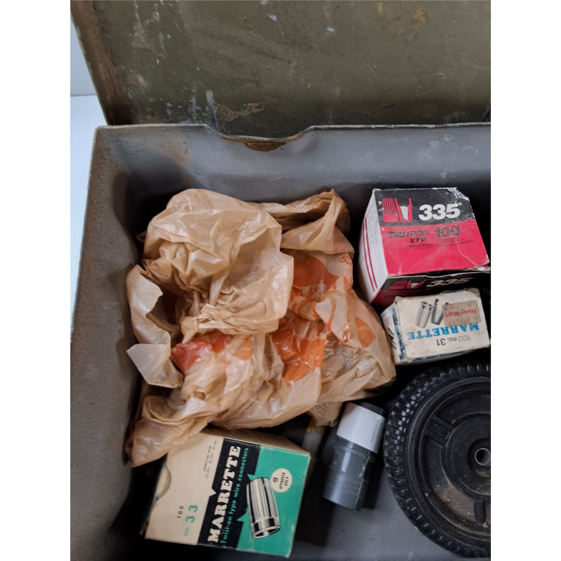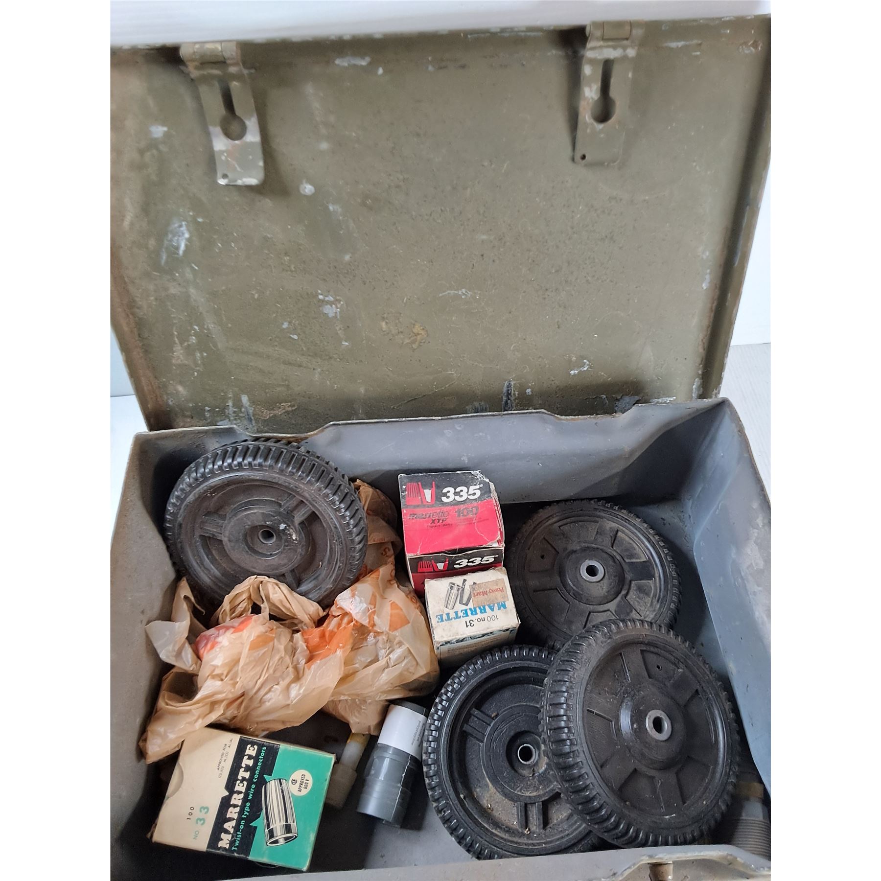 Metal Box 20.5'' x 14'' x 8'', (4) Plastic wheels, Wire Connectors, Misc - As IS