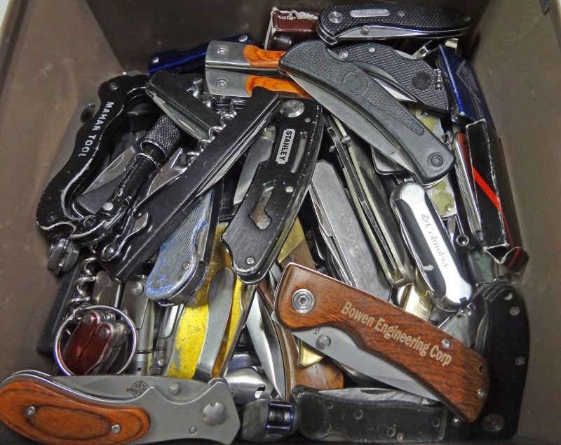 Metal Box of various pocket knives, corkscrews, multi-tools and more. Various sizes, designs, blade lengths, brands, tools/functions, and some have advertising and company logos on them. ESTIMATE: $100-$150