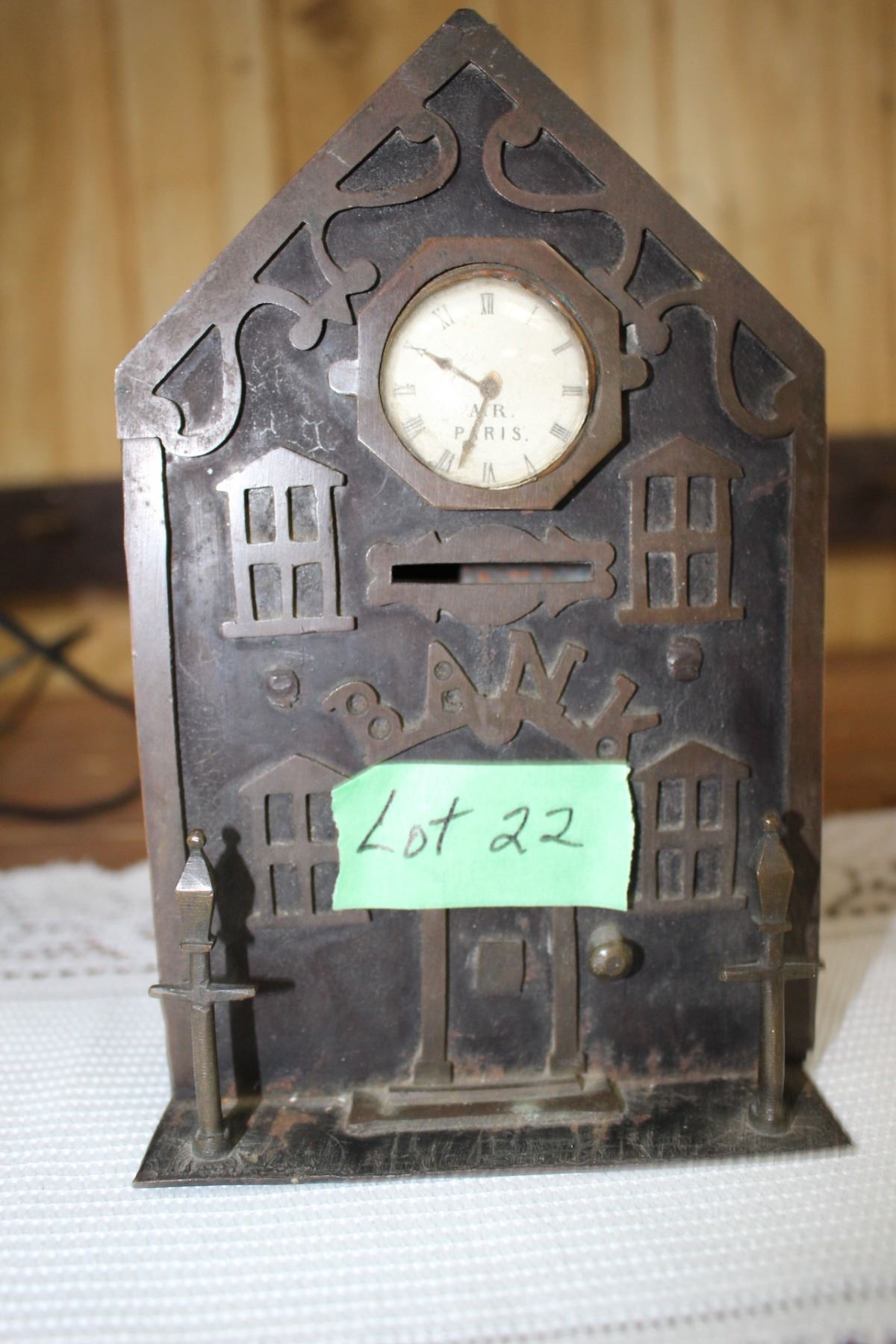 Metal Building Bank with Clock Insert ' A.R. Paris'