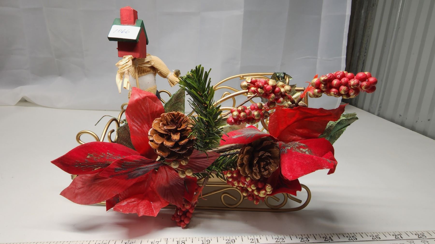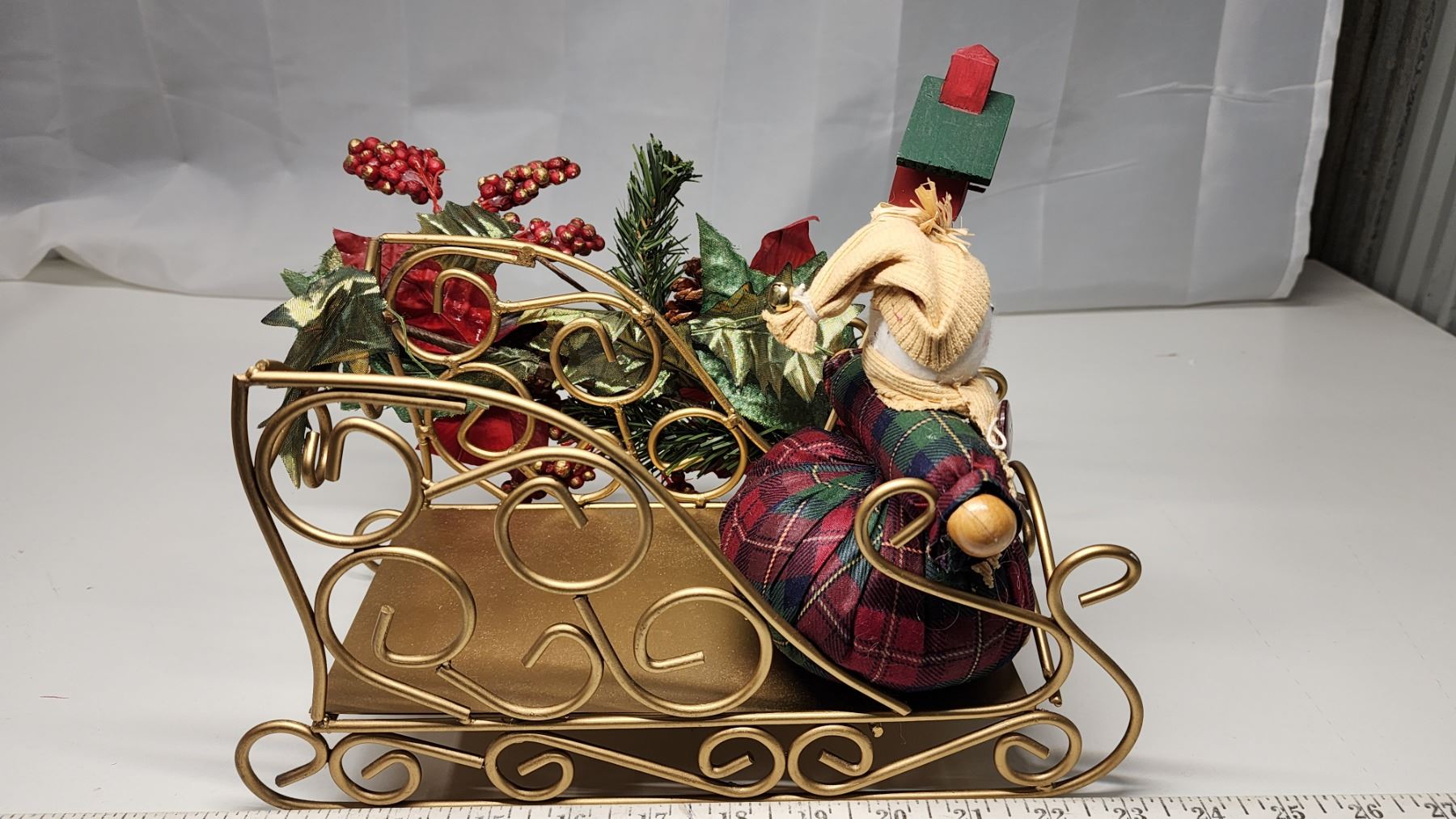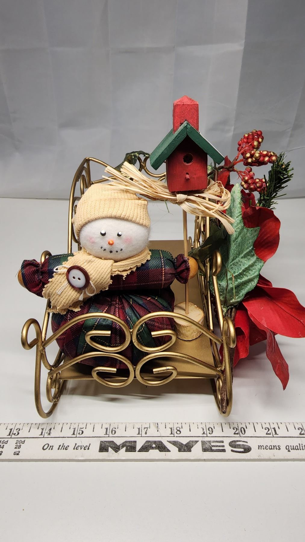 Metal CHRISTMAS SLEIGH with homemade snowgirl with birdhouse